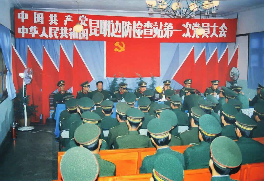图为:1986年7月,昆明边防检查站召开第一次党员大会,产生新一届党委。