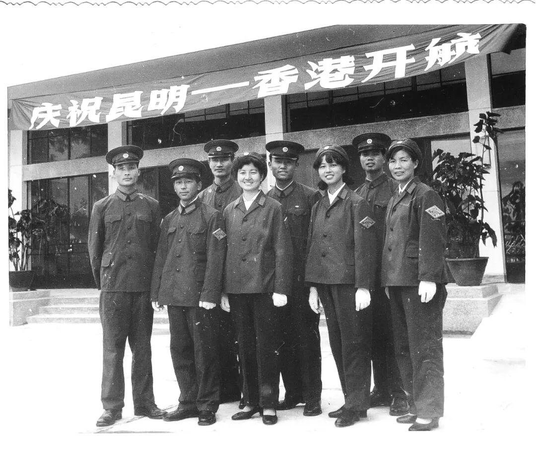 一张泛黄的老照片,定格了春城国门的起点:巫家坝机场前,五位年轻官兵身姿挺拔,身后“昆明”二字朴素而坚定。