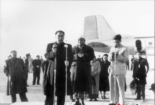 图为:周恩来总理在昆明巫家坝机场欢送缅甸总理吴努时致辞。