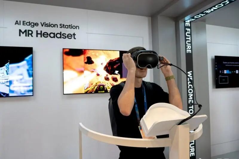 一个颇具标志性的产品是,三星此次展示的RGB OLEDoS(硅基OLED)头戴设备演示机型。这块仅1.4英寸的微型显示屏,像素密度达到5000 PPI,像素数量接近4K电视的三倍。三星通过可佩戴、可交互的沉浸式演示,呈现RGB OLEDoS在动态场景下的画质表现。