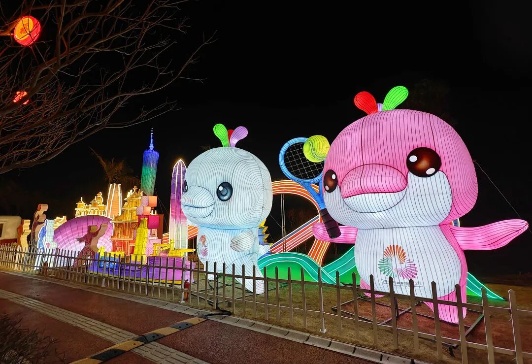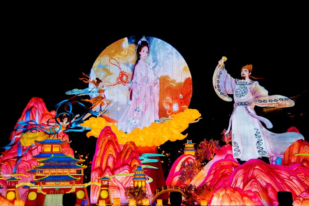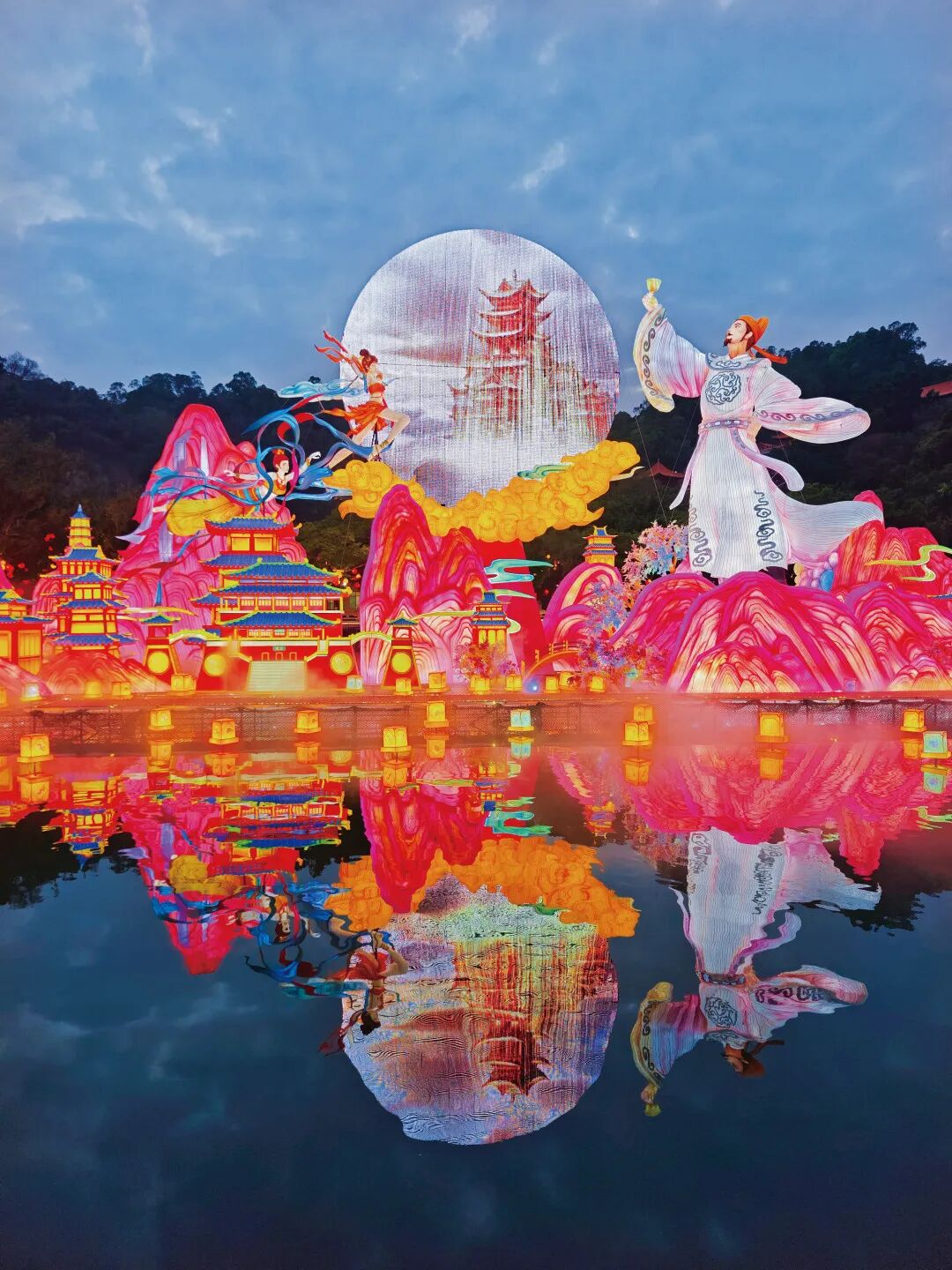 “李白对月”灯组位于天后湖水面区域,灯体长达60米、高18米,构成一幅古人今人“同赏一轮月、灯聚湾区情”的诗意画卷。