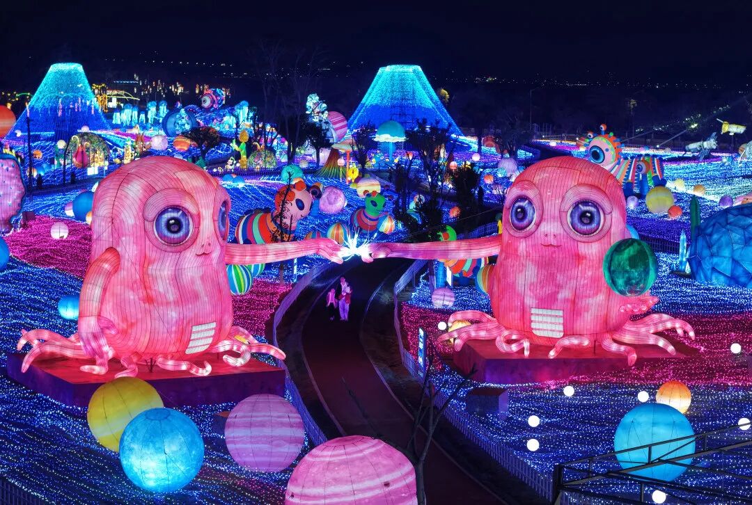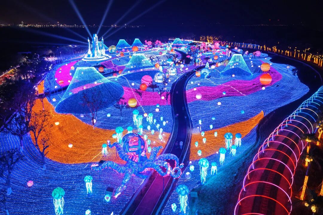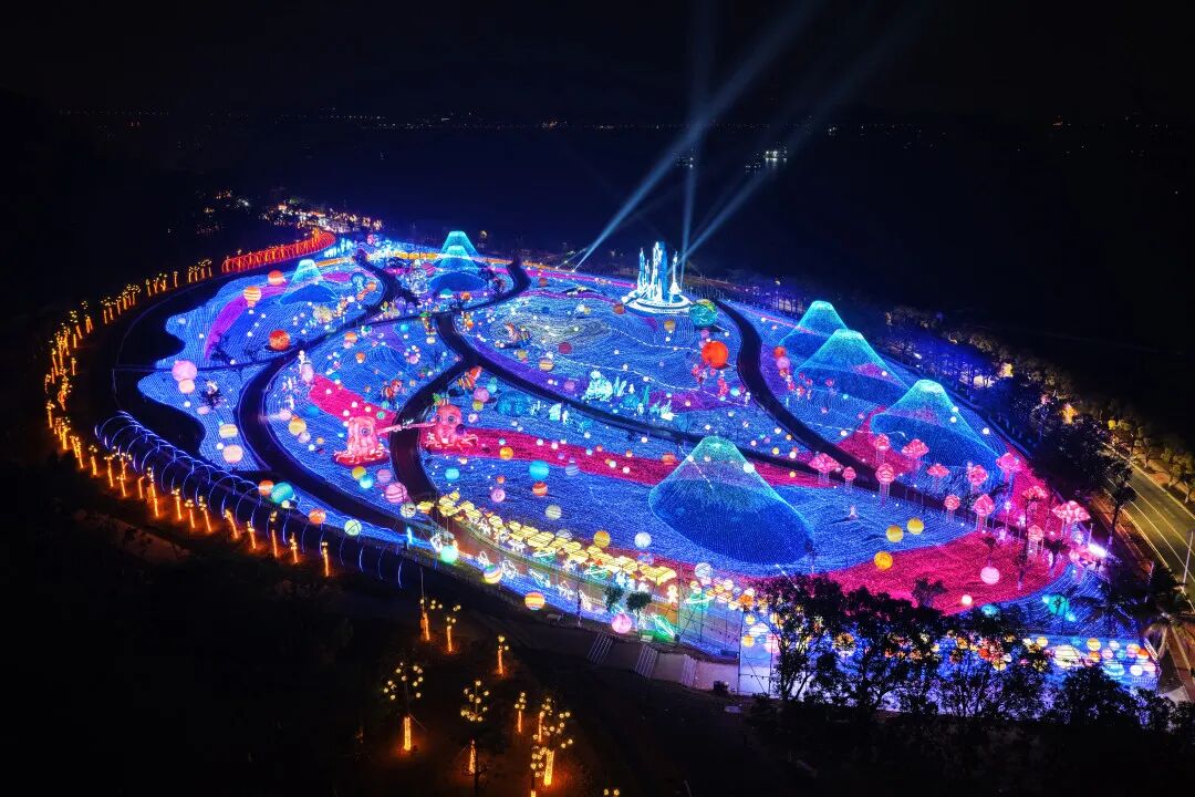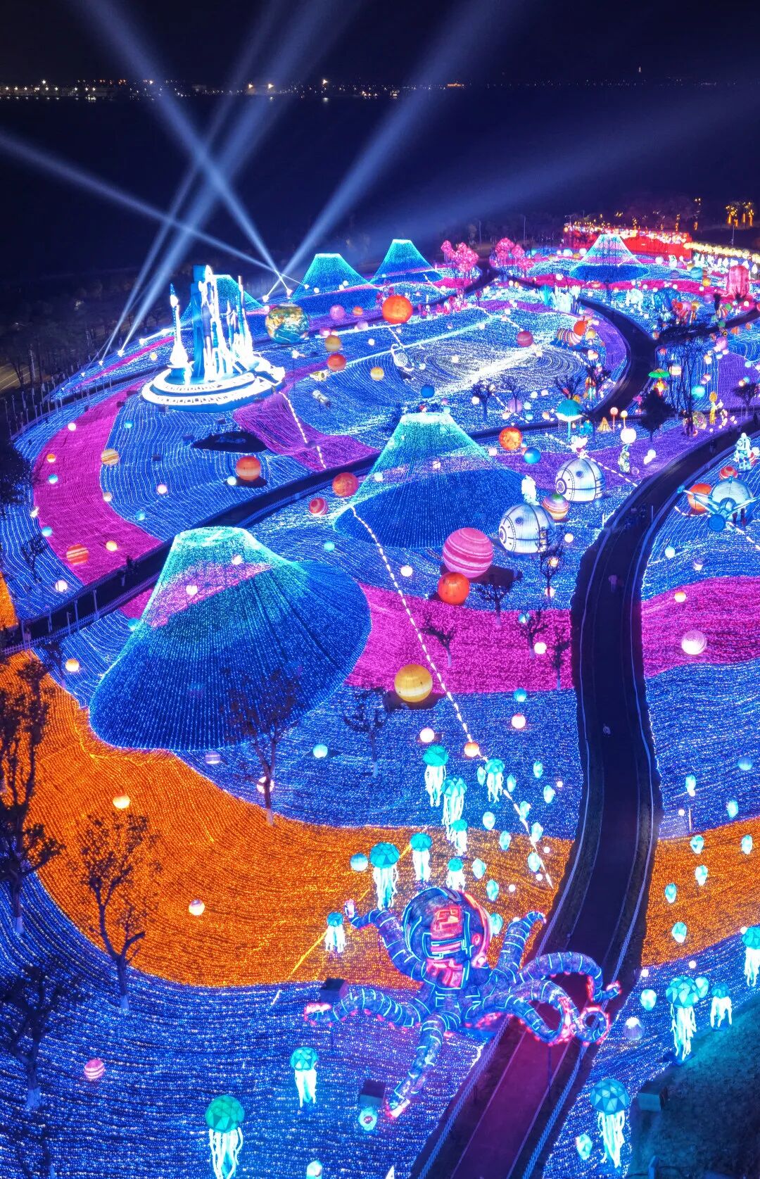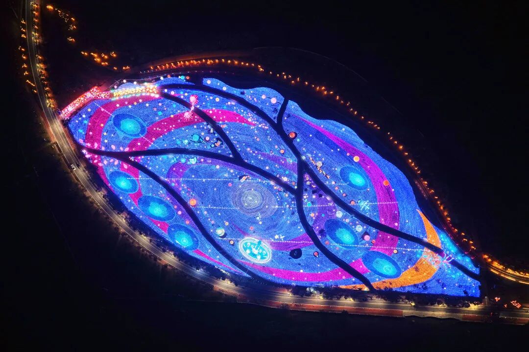 在夜色里俯瞰“银河漫步·星际奇旅” 灯组,恍如一片闪闪发光的“叶子”。