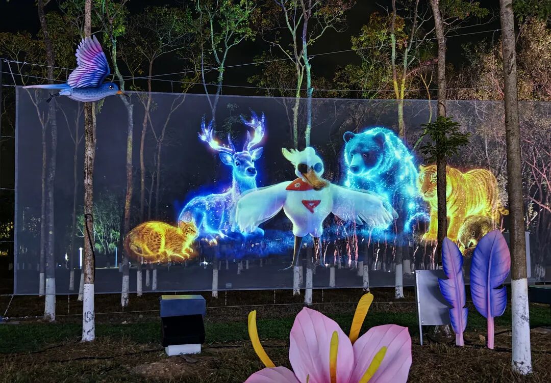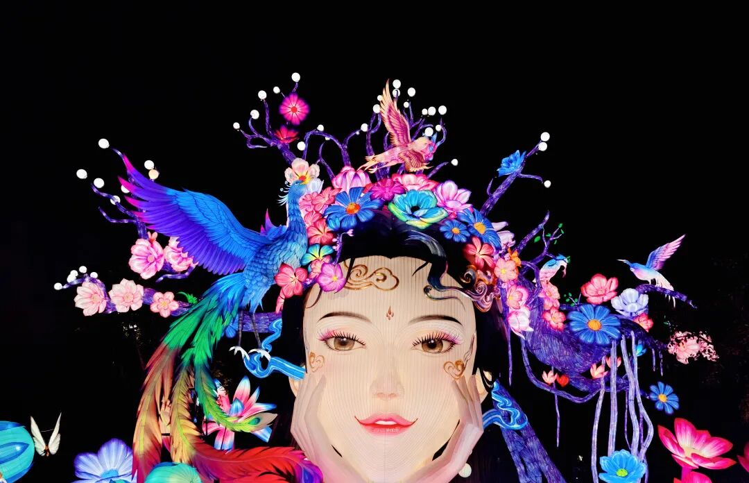 “花神苏醒”灯组。“花神苏醒”灯组高达16米,灯组通过动态特效呈现花神眼睛眨动、飞鸟环绕、花瓣舒展的逼真效果。