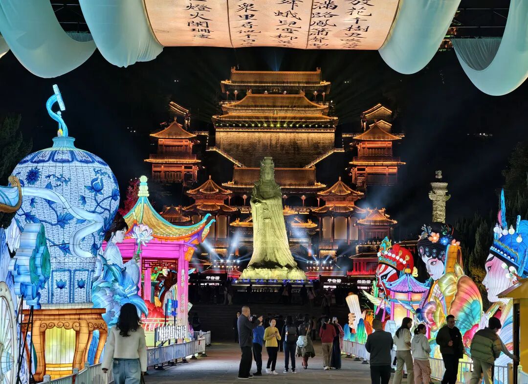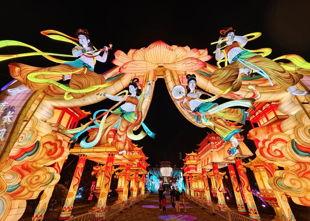“大唐夜宴” 灯组。 “大唐夜宴” 灯组以敦煌飞天为核心意象,身着典型唐代服饰的飞天仙子姿态曼妙,或弹奏琵琶,或舒展彩带,灵动飘逸,尽显“万国衣冠拜冕旒”的盛唐繁华。