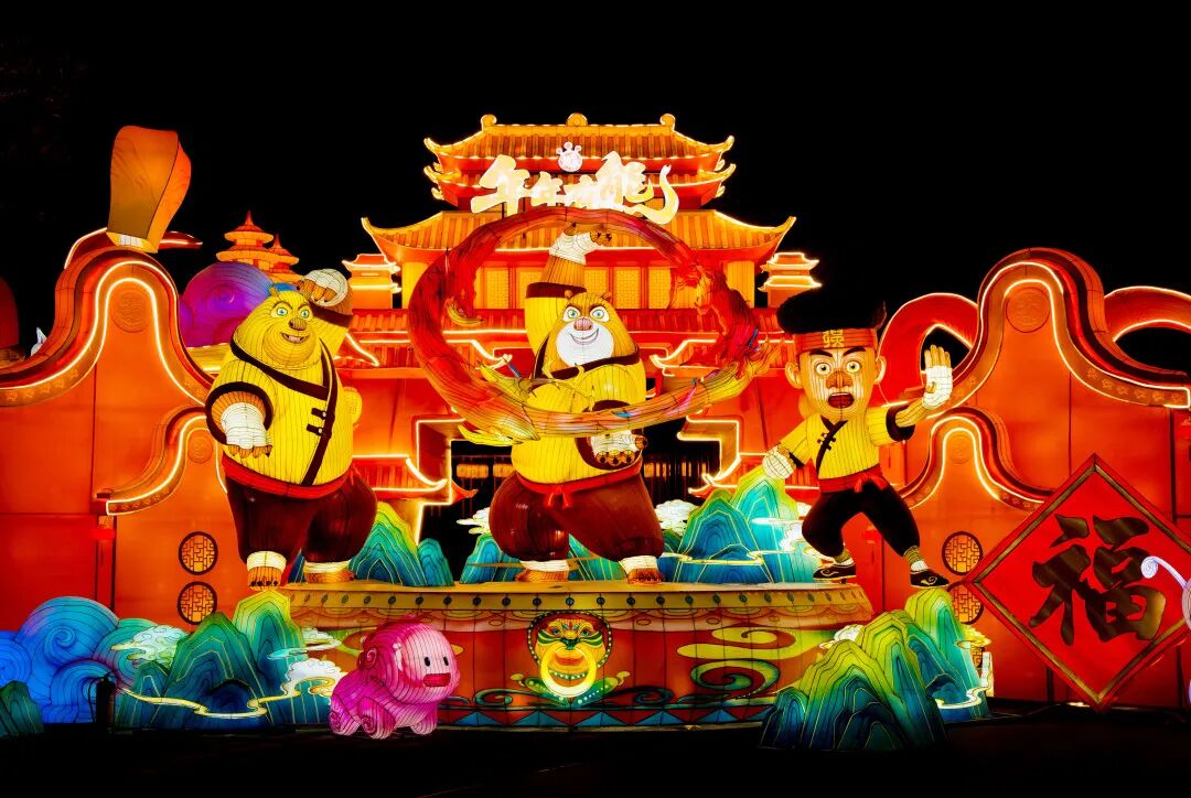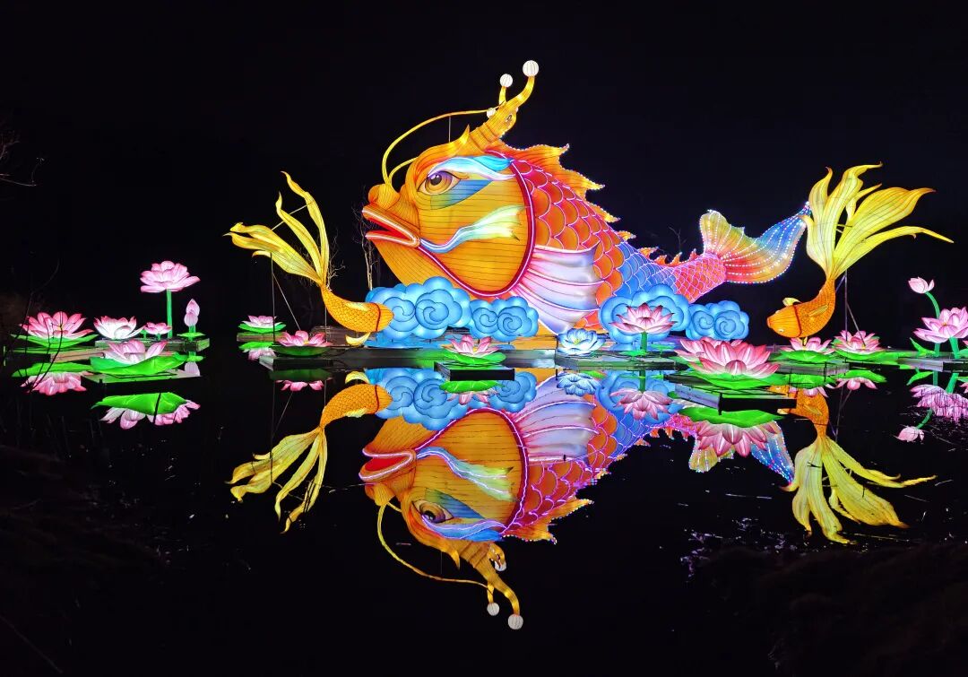 “鳌鱼凌云”灯组以中国上古神话中的鳌鱼为设计原型,巨型鳌鱼打破静态展示的局限,通过动态结构、光影特效与水景融合,完美诠释“鳌鱼出海,福泽四方”的吉祥寓意。