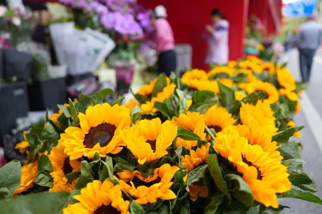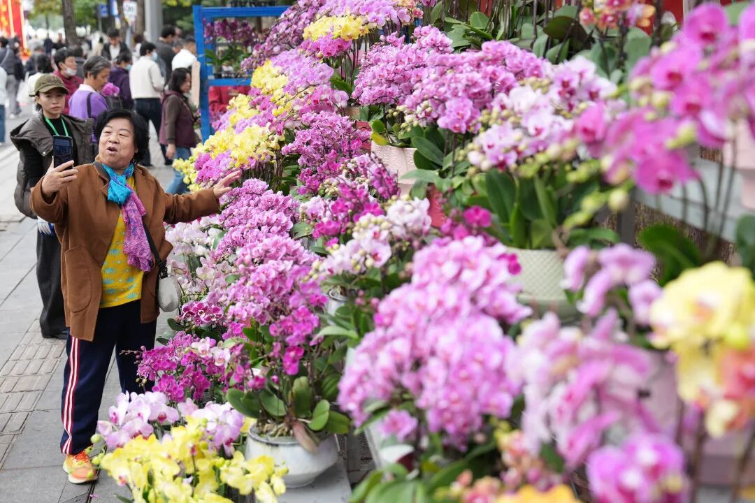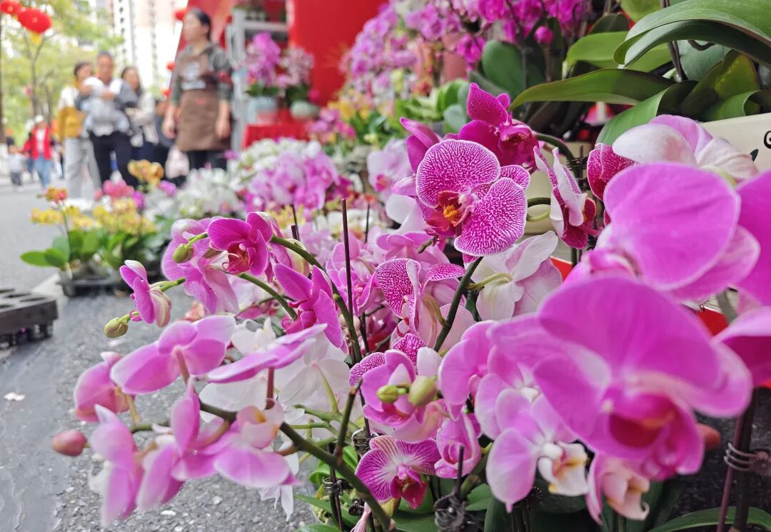 各色盆花、鲜花等整齐地摆放在道路两边和摊档中,供市民们挑选。