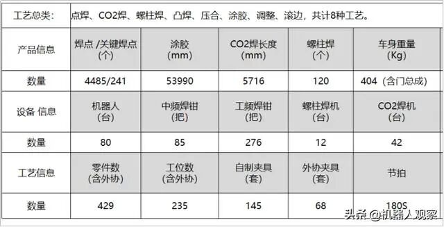 整个焊装线工艺结构非常紧密,包含点焊、CO2焊、螺柱焊、凸焊、压合、涂胶、调整、滚边,共计8种工艺。
