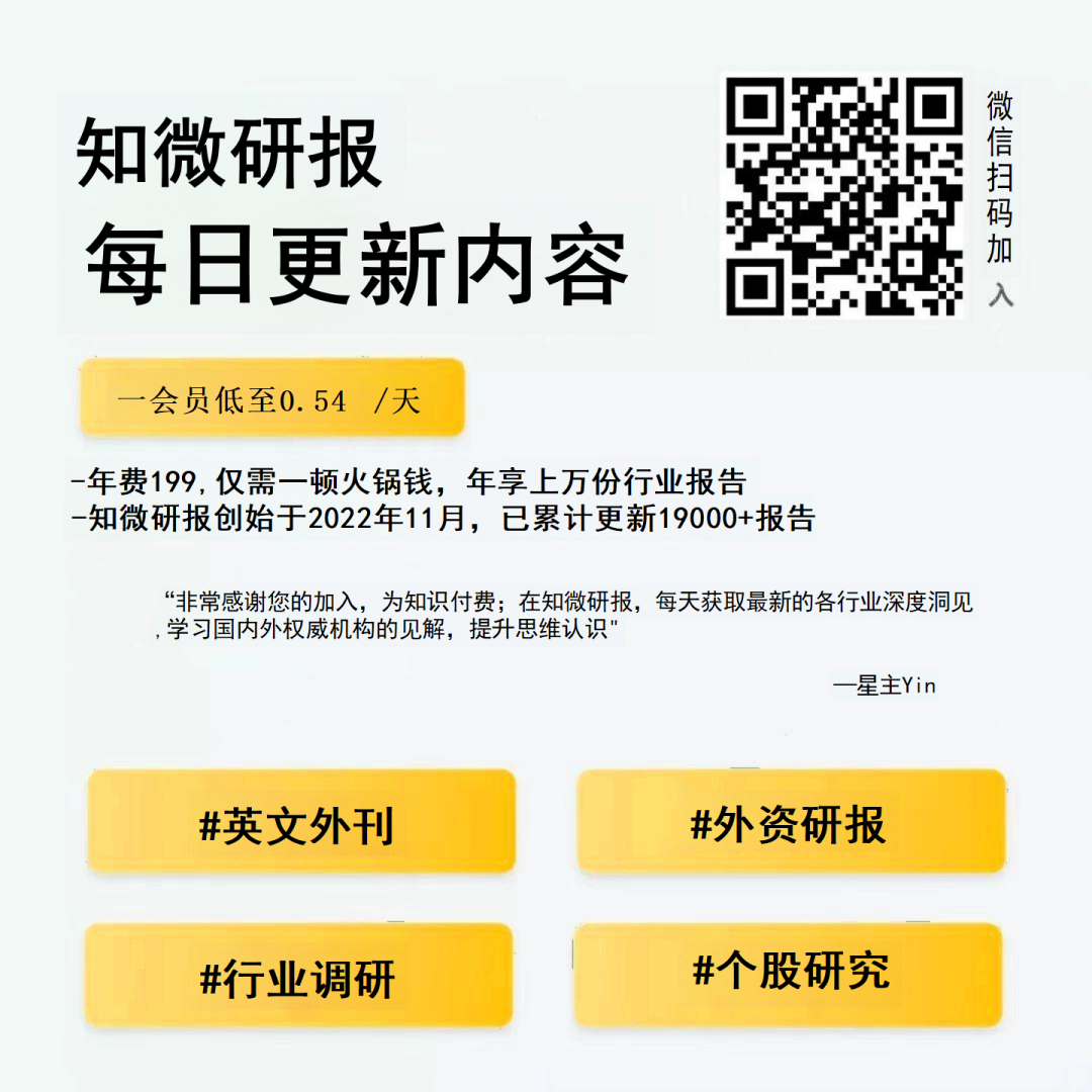 欢迎来到知微研报,知识星球每日更新60-100+份精选报告,分享海内外各权威机构专业研究报告,全面的了解各行业趋势,请扫描下方二维码成为知微研报的年费会员,即可下载包含历史更新在内的2W+原版PDF格式报告。