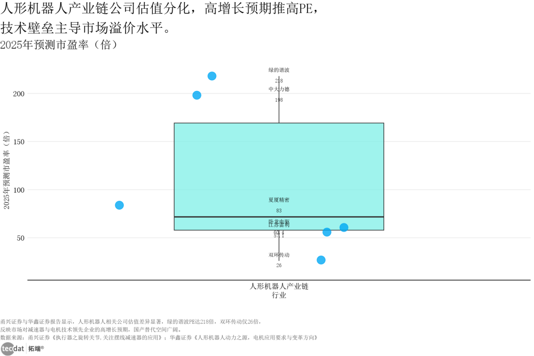 人形机器人产业链估值呈现明显分层,核心零部件企业享有显著估值溢价:绿的谐波2025年预测市盈率达218倍,中大力德198倍,而通用机械转型企业双环传动仅26倍。差异核心在于技术壁垒与业务纯度——高估值企业聚焦减速器、电机等“卡脖子”环节,直接受益于量产预期;低估值企业机器人业务占比低,业绩弹性不足,难以享受行业增长红利。