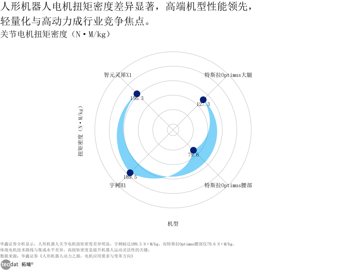关节电机性能分化显著,国产机型实现弯道超车:宇树H1的扭矩密度达189.5 N·M/kg,远超特斯拉Optimus腰部的79.6 N·M/kg,体现国内企业在高功率密度技术路线上的优势,而扭矩密度直接决定机器人运动灵活性,是高端产品的核心竞争力。