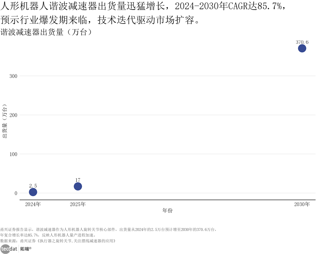 人形机器人正从技术演示走向商业落地:宇树H1机器人实现演唱会高难度伴舞,Figure 02在宝马工厂累计装载超9万个零件,运行时长突破1250小时,标志着产品稳定性与场景适配性已达实用标准。核心零部件成为“卡脖子”环节,其中谐波减速器作为旋转关节核心部件,2024年至2030年出货量预计从2.5万台飙升至370.6万台,年复合增长率85.7%,需求呈爆发式增长,六年增长148倍。