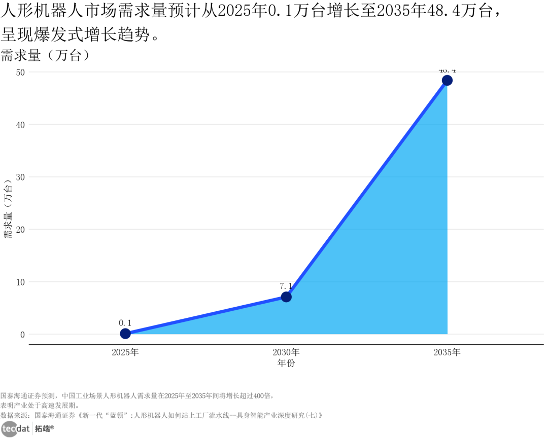 从人形机器人市场需求量来看,2025-2035年需求量呈填充式增长,2030年突破7万台,2035年达48.4万台,工业场景是核心驱动力。