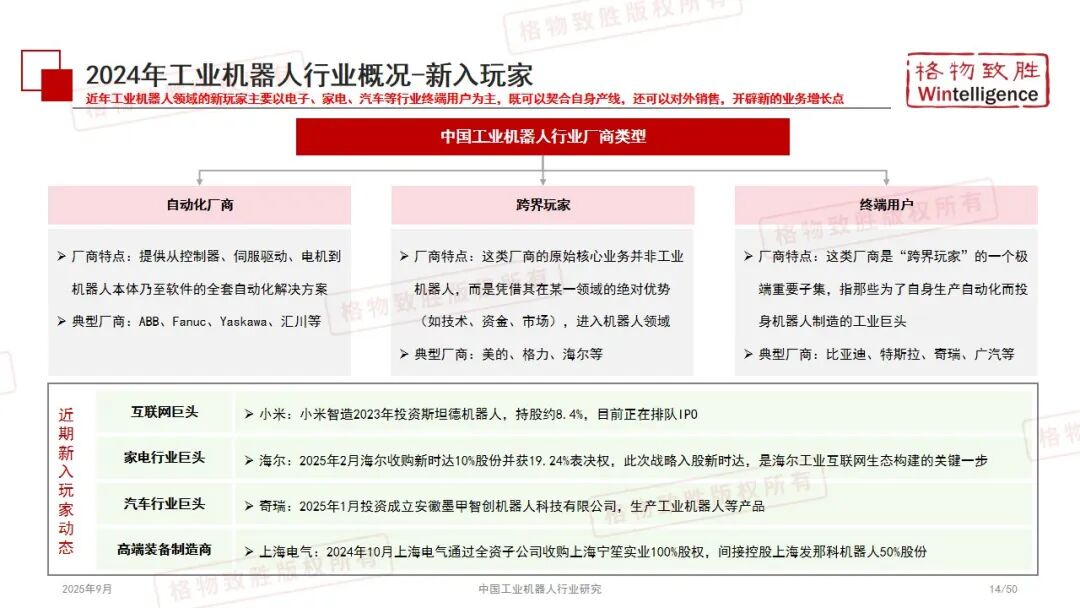 政策体系不断完善,全方位驱动行业发展。国家政策从产业化阶段向高端化、智能化、国产化升级,“十四五” 机器人产业发展规划明确 2025 年成为全球技术创新策源地,制造业机器人密度翻倍;《机械工业数字化转型实施方案》等政策推动技术融合与场景拓展。2023-2024 年多项支持性、规范性政策出台,涵盖数字化改造、5G 融合应用、行业准入等,为产业发展提供制度保障,同时引导企业向高质量转型。 市场规模稳中有升,细分产品结构分化。2024 年工业机器人销量约 34.24 万台,2027 年预计达 43.41 万台,CAGR 9%。细分产品中,协作机器人表现最优,2024 年销量增速达 27.3%,成为增长最快品类;SCARA 机器人受电子行业复苏带动,销量增长 5.3%;Delta 机器人需求稳定,增速 5.3%;多关节机器人受新能源行业需求下滑影响,销量小幅下滑。应用场景中,搬运(39%)、焊接(29%)占比最高,合计超 60%,2024 年保持稳定增长。 国产化进程加速,本土企业份额持续提升。2020-2025 年,本土品牌市场份额从 28% 升至 44%,外资品牌占比从 72% 降至 56%。国产厂商凭借高性价比、快速响应及政策支持,在中低端市场占据主导,逐步向高端突破:汇川技术 SCARA 机器人市占率第一,埃斯顿、埃夫特等企业销量增速超 30%,远超外资品牌。核心零部件自主化率提升,埃斯顿核心部件自主化率超 90%,打破国外垄断。 应用领域持续拓展,从传统制造向新兴行业延伸。汽车制造业仍是第一大应用领域(占比 27%),2024 年增速 10%,新能源汽车带动焊接、装配等场景需求;电子行业占比 21%,增速 11.3%,受益于周期性复苏;金属加工(13%)、食品饮料(7%)、医药(3%)等行业需求稳健增长。而锂电、光伏等新能源行业因产能过剩,需求大幅下滑(光伏增速 - 17.6%),行业应用结构更趋多元。 技术趋势聚焦智能化与融合化,企业布局全球化。技术上,工业机器人与 AI、5G、边缘计算深度融合,人形机器人快速发展,埃斯顿、新松等企业推出相关产品并推进批量交付;协作机器人向大负载、高柔性升级,珞石机器人发布 45kg 超大负载产品。企业层面,头部厂商加速产能扩张(埃斯顿一期 + 二期年产能 5 万台)、海外布局(汇川技术欧洲工厂建设中)及跨界整合(海尔收购新时达股权),行业竞争从产品竞争向生态竞争升级。