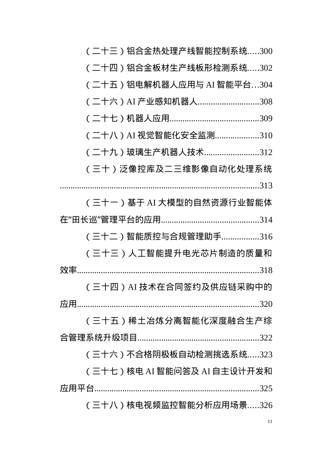 “人工智能 + 制造” 典型应用场景共 59 项,覆盖铝加工、稀土冶炼、核电、玻璃制造等行业,应用 AI 视觉检测、预测性维护、智能调度等技术,如铝合金产线智能控制、稀土熔融金属出炉机器人、核电 AI 智能问答等,突出绿色低碳、安全生产与效率提升。