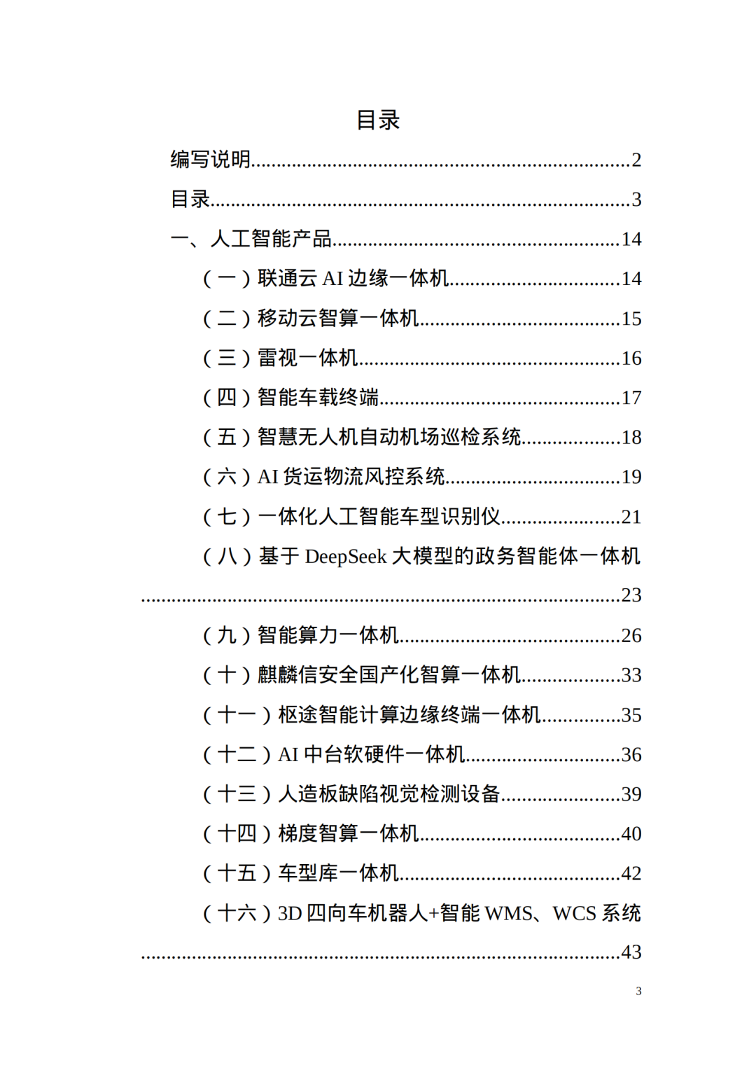 人工智能产品共 66 项,覆盖基础硬件、智能医疗、智能家居等多类别,核心亮点是深度集成 DeepSeek 大模型,如联通云 AI 边缘一体机、移动云智算一体机等,兼具国产化适配、低门槛部署、安全可控等优势;行业专用设备丰富,包括交通领域的雷视一体机、智能车载终端,农业领域的福寿螺防治机器人、柑橘无人采摘系统,制造领域的人造板缺陷检测设备等,已在多场景落地并实现降本增效。
