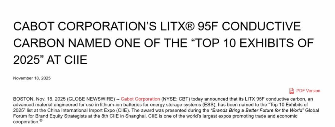 据悉,第八届中国国际进口博览会吸引了155个国家、地区及国际组织参与,参展企业数量超过4100家。卡博特此次凭借LITX 95F导电炭黑获奖,进一步凸显了其在提供高性能储能材料、助力储能产业未来发展方面的持续领先优势。