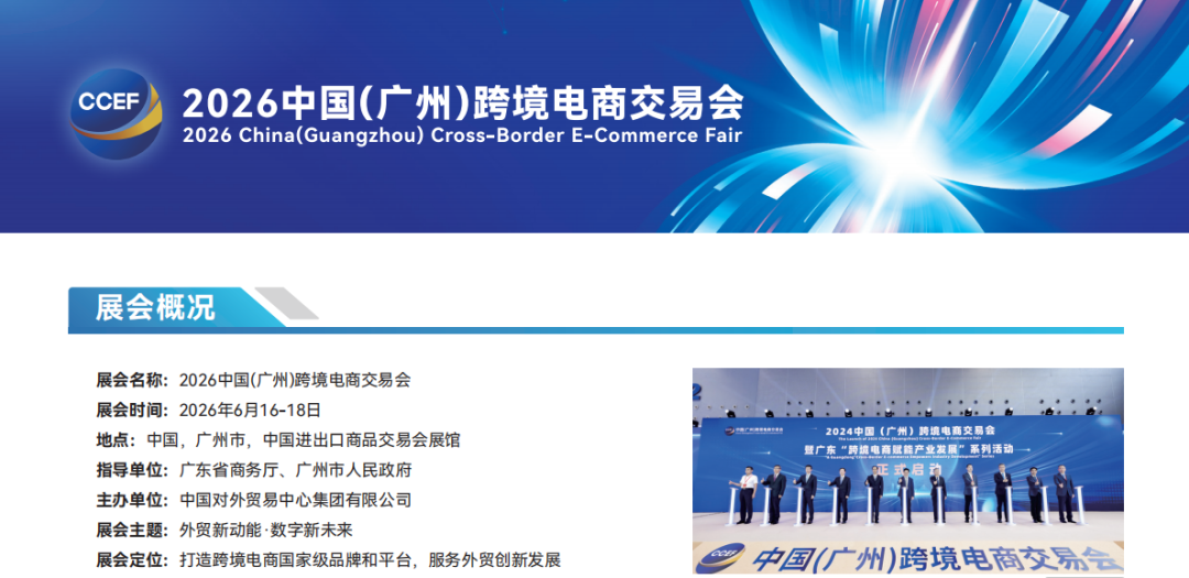 2026年6月16日至18日,由国家商务部外贸发展事务局指导,中国对外贸易中心集团有限公司主办的 2026中国(广州)跨境电商交易会(秋季) 将在广州琶洲·中国进出口商品交易会展馆A区隆重举行。