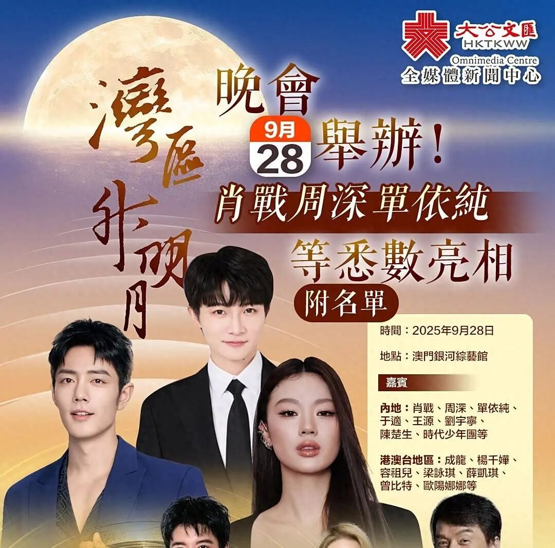 今年的“湾区升明月”晚会节目单,刚刚公布。王力宏、单依纯、成龙、肖战、林志炫、容祖儿、周深、杨千嬅、周笔畅、时代少年团……名字太多了,真的,看着就眼花。