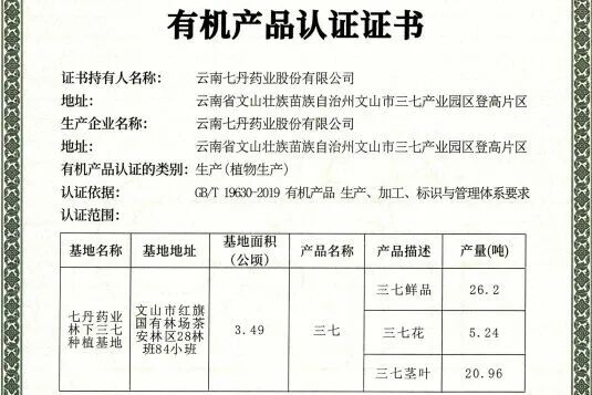 七丹药业位于文山市红旗国有林场的林下三七种植基地以及公司自主生产的三七、三七粉及鲜三七原浆再次荣获“有机产品认证证书”