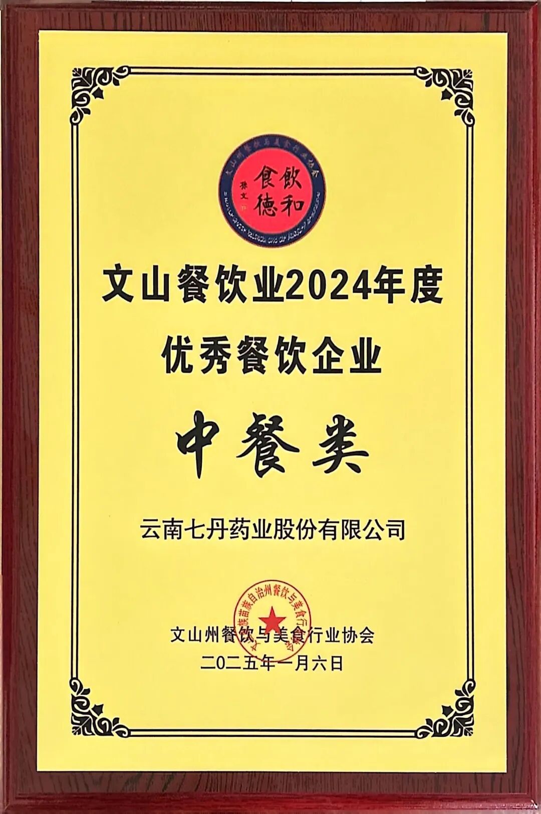 七丹药业获评“文山餐饮业 2024 年度优秀餐饮企业 - 中餐类”