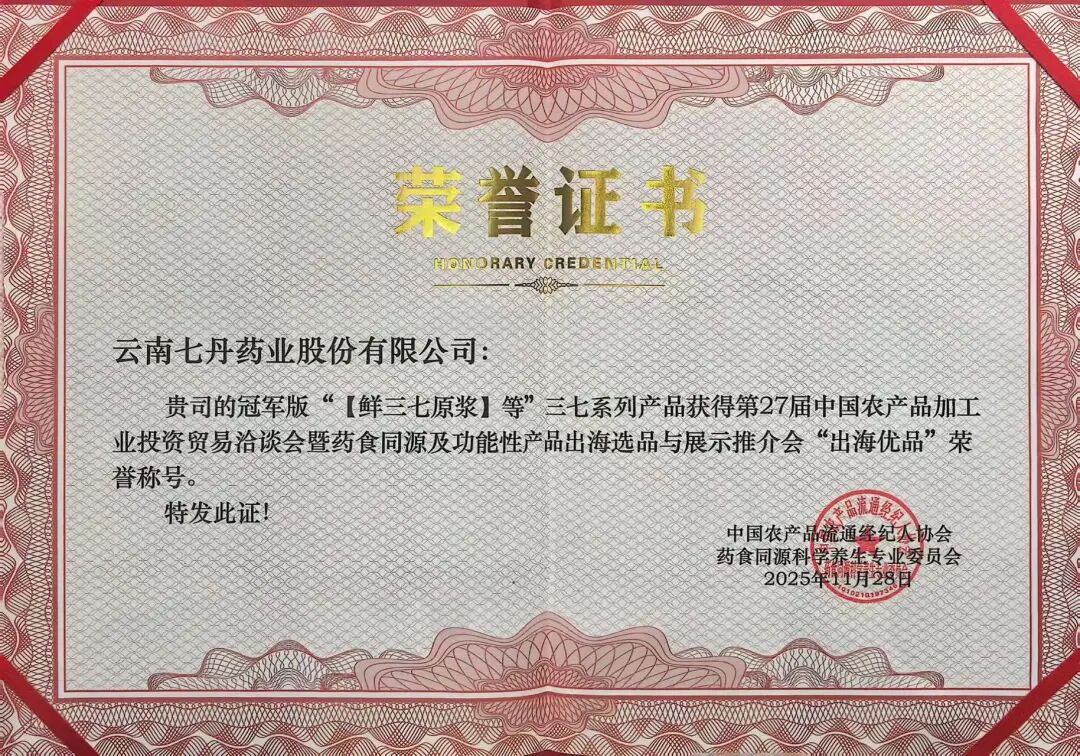公司“鲜三七原浆”在第27届中国农产品加工业投资贸易洽谈会暨药食同源及功能性产品出海选品与展示推介会上获评“出海优品”称号