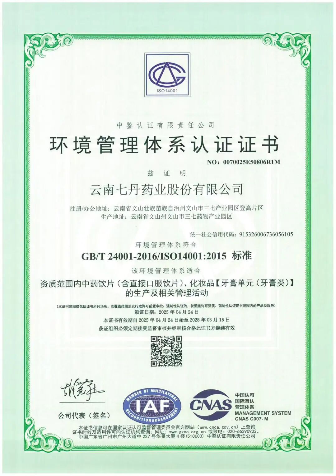 公司中药饮片、化妆品生产通过ISO14001环境管理体系认证