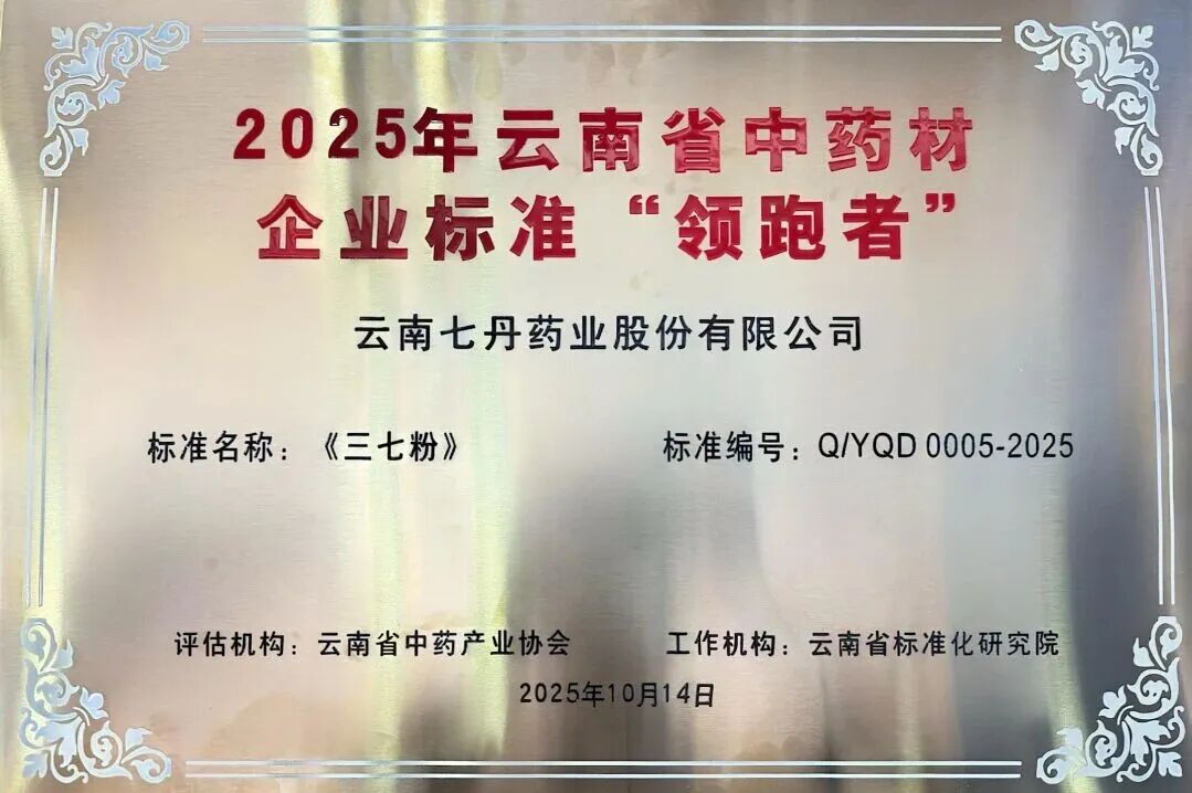 七丹药业三七粉荣获2025年云南省企业标准“领跑者”荣誉称号