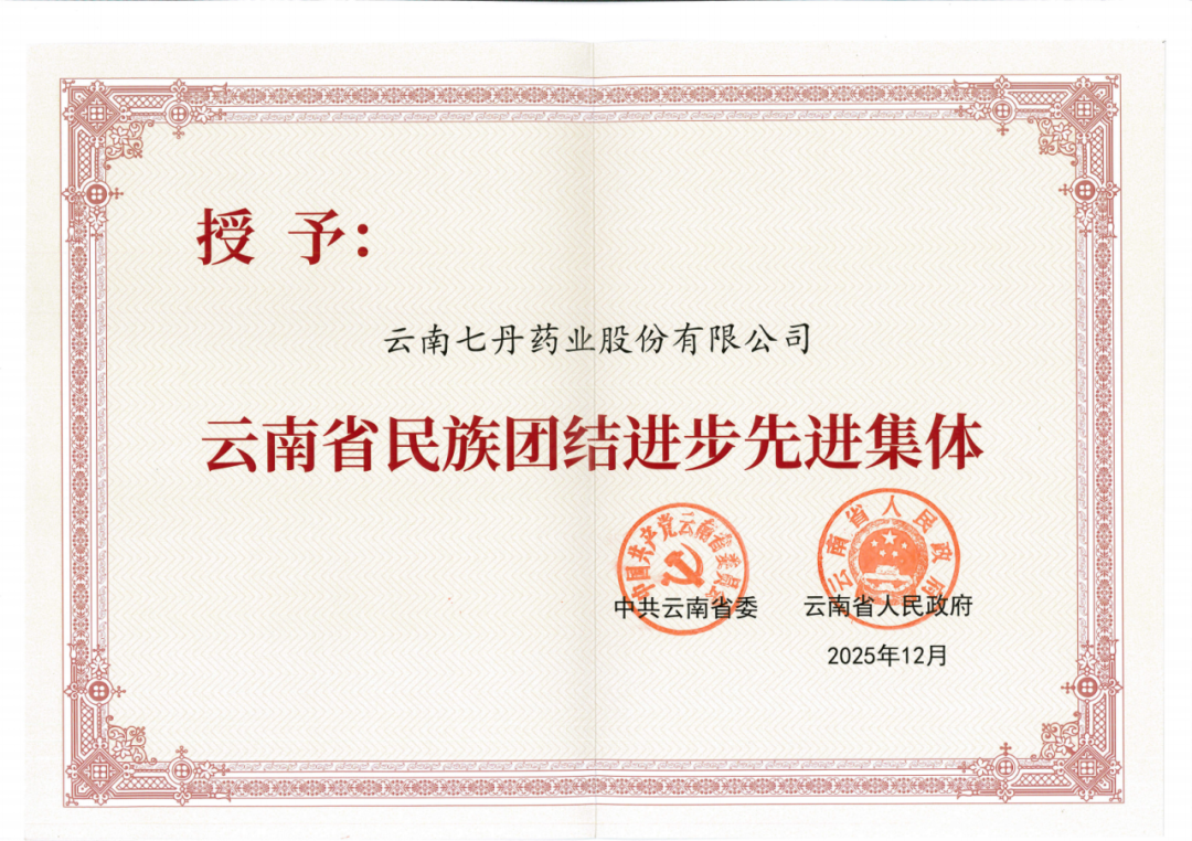 七丹药业获评“云南民族团结进步先进集体”荣誉称号。