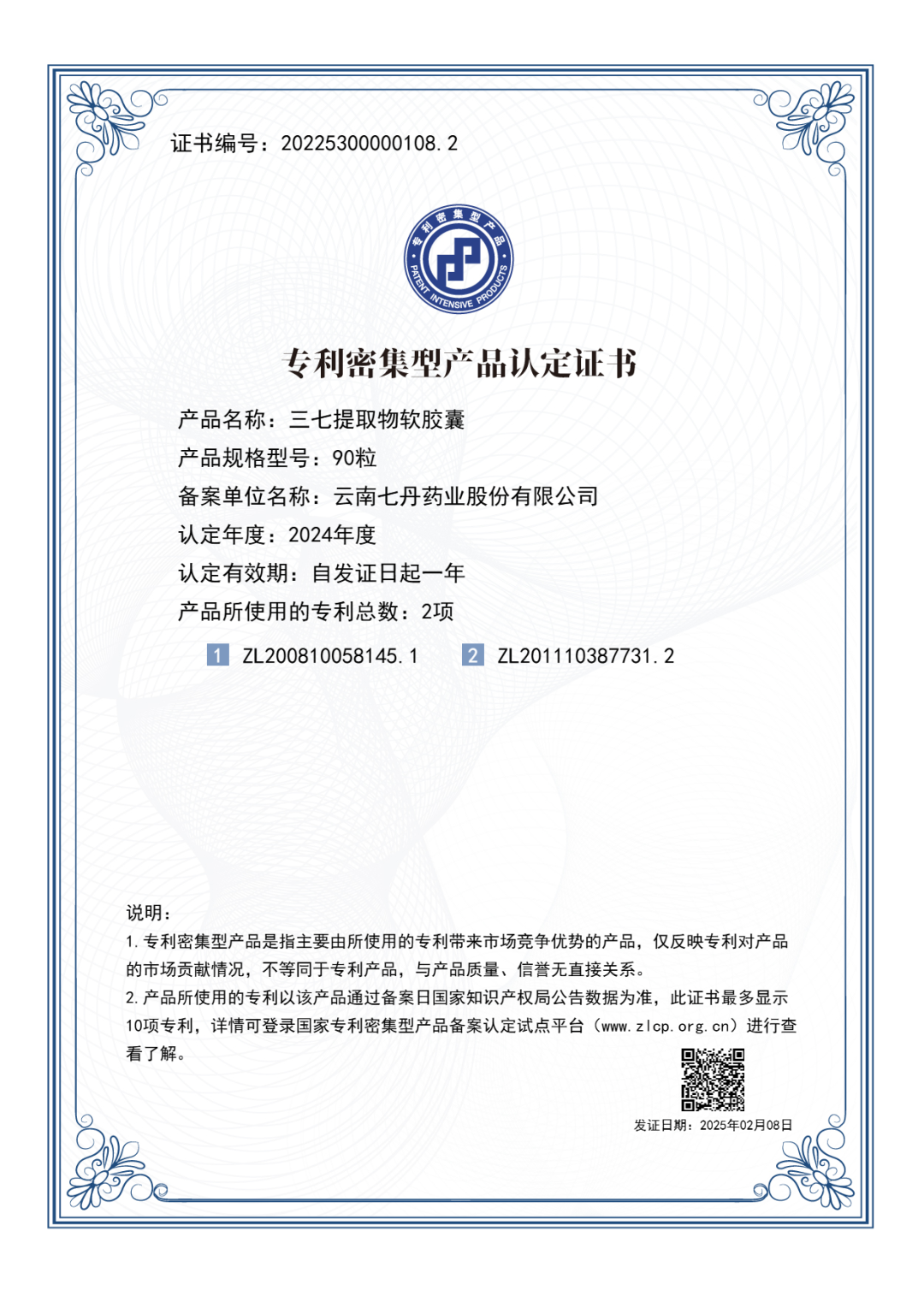 七丹牌三七提取物软胶囊获专利密集型产品认定