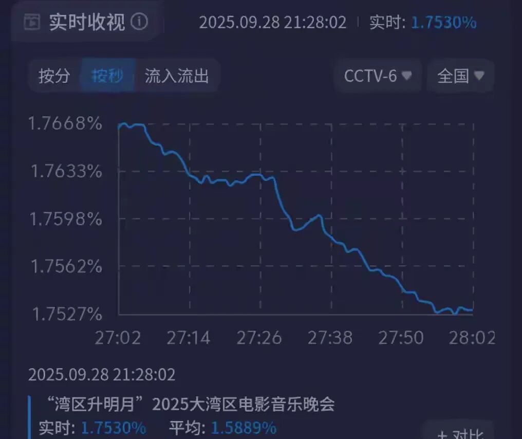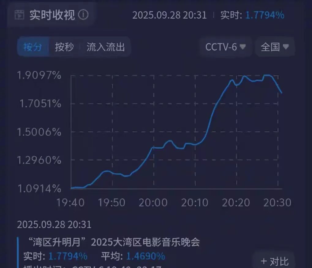 当“湾区升明月”的旋律落下,2025大湾区电影音乐晚会的收视成绩单终于揭开面纱——即便集齐了肖战、王力宏等超百位新老艺人,献上50+表演节目,这场备受期待的晚会,全国收视峰值仍没能冲破2%,最终停在1.93%的数字上,多少有些让人意外。