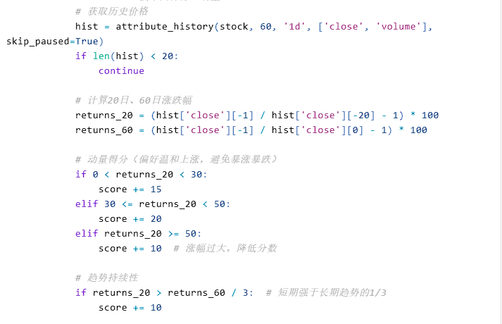 # 2026年机器人概念热度股筛选策略from jqdata import *import pandas as pdimport numpy as npfrom datetime import datetime, timedelta# ============ 初始化设置 ============def initialize(context):# 设置基准set_benchmark('000300.XSHG')# 开启动态复权set_option('use_real_price', True)# 设置滑点set_slippage(FixedSlippage(0.002))# 设置交易成本set_order_cost(OrderCost(open_tax=0, close_tax=0.001,open_commission=0.0003, close_commission=0.0003,close_today_commission=0, min_commission=5))# 设置持仓数量g.hold_count = 10# 设置调仓周期(每月第一个交易日)g.trade_days = 0# 机器人概念股池(按相关度分类)# Tier 1: 核心零部件供应商(最高相关度)g.tier1_stocks = ['603728.XSHG', # 鸣志电器 - 运动控制/空心杯电机'688017.XSHG', # 绿的谐波 - 谐波减速器龙头'002050.XSHE', # 三花智控 - 热管理/执行器'601689.XSHG', # 拓普集团 - 执行器/电驱'003021.XSHE', # 兆威机电 - 微型传动'688160.XSHG', # 步科股份 - 无框力矩电机'002472.XSHE', # 双环传动 - 精密减速器]# Tier 2: 重要零部件及系统供应商g.tier2_stocks = ['300124.XSHE', # 汇川技术 - 伺服系统'002747.XSHE', # 埃斯顿 - 工业机器人'002896.XSHE', # 中大力德 - 减速器'603662.XSHG', # 柯力传感 - 力矩传感器'300503.XSHE', # 昊志机电 - 电主轴/谐波'603009.XSHG', # 北特科技 - 丝杠'603667.XSHG', # 五洲新春 - 轴承/丝杠'301368.XSHE', # 丰立智能 - 减速器]# Tier 3: 整机及应用端g.tier3_stocks = ['688218.XSHG', # 江苏北人 - 工业机器人系统'002698.XSHE', # 博实股份 - 特种机器人'300607.XSHE', # 拓斯达 - 工业机器人'688255.XSHG', # 凯尔达 - 焊接机器人'300024.XSHE', # 机器人 - 新松机器人]# 合并所有股票池g.all_stocks = g.tier1_stocks + g.tier2_stocks + g.tier3_stocks# 运行定时任务(每月第一个交易日调仓)run_monthly(rebalance, 1, time='09:30')# ============ 选股与评分函数 ============def get_robot_score(context, stock_list):"""计算机器人相关度综合评分评分维度:1. 基本面:营收增速、研发投入2. 技术面:动量、波动率3. 热度:成交量变化、资金流入4. 产业链位置权重(Tier1权重最高)"""scores = {}for stock in stock_list:try:score = 0# ===== 1. 产业链位置权重(基础分)=====if stock in g.tier1_stocks:base_score = 40 # 核心零部件最高分elif stock in g.tier2_stocks:base_score = 30 # 重要供应商else:base_score = 20 # 整机应用端score += base_score# ===== 2. 技术面评分(动量)=====# 获取历史价格hist = attribute_history(stock, 60, '1d', ['close', 'volume'], skip_paused=True)if len(hist) < 20:continue# 计算20日、60日涨跌幅returns_20 = (hist['close'][-1] / hist['close'][-20] - 1) * 100returns_60 = (hist['close'][-1] / hist['close'][0] - 1) * 100# 动量得分(偏好温和上涨,避免暴涨暴跌)if 0 < returns_20 < 30:score += 15elif 30 <= returns_20 < 50:score += 20elif returns_20 >= 50:score += 10 # 涨幅过大,降低分数# 趋势持续性if returns_20 > returns_60 / 3: # 短期强于长期趋势的1/3score += 10# ===== 3. 成交量热度 ======vol_mean_20 = hist['volume'][-20:].mean()vol_mean_60 = hist['volume'][:20].mean()vol_ratio = vol_mean_20 / vol_mean_60 if vol_mean_60 > 0 else 1if 1.2 <= vol_ratio < 3: # 成交量温和放大score += 15elif vol_ratio >= 3: # 过度放量score += 5# ===== 4. 基本面过滤 ======# 获取财务数据(季度营收增速)q = query(indicator).filter(indicator.code == stock)df = get_fundamentals(q)if not df.empty:revenue_growth = df['indicator.inc_revenue'][0]if revenue_growth and revenue_growth > 20: # 营收增速>20%score += 10elif revenue_growth and revenue_growth > 0:score += 5# ===== 5. 市值与流动性过滤 ======current_data = get_current_data()[stock]market_cap = current_data.market_cap # 总市值(亿)if market_cap and market_cap > 50: # 市值大于50亿score += 5if market_cap and market_cap > 200: # 大市值龙头加分score += 5scores[stock] = scoreexcept Exception as e:log.error(f"计算{stock}分数出错: {str(e)}")continuereturn scores# ============ 调仓逻辑 ============def rebalance(context):# 获取评分scores = get_robot_score(context, g.all_stocks)if not scores:log.info("未获取到有效评分,跳过本次调仓")return# 按评分排序sorted_stocks = sorted(scores.items(), key=lambda x: x[1], reverse=True)# 选择前N只股票target_stocks = [stock for stock, score in sorted_stocks[:g.hold_count]]# 输出选股结果log.info("========== 本周期机器人概念股排名 ==========")for i, (stock, score) in enumerate(sorted_stocks[:15], 1):name = get_security_info(stock).display_nametier = "T1" if stock in g.tier1_stocks else ("T2" if stock in g.tier2_stocks else "T3")log.info(f"{i}. {name}({stock}) - {tier} - 评分: {score}")# 调仓执行adjust_positions(context, target_stocks)def adjust_positions(context, target_stocks):"""调整持仓:卖出不在目标列表的股票,买入目标股票"""current_holdings = list(context.portfolio.positions.keys())# 1. 卖出不在目标列表的股票for stock in current_holdings:if stock not in target_stocks:order_target(stock, 0)log.info(f"卖出: {stock}")# 2. 计算每只目标股票的仓位if target_stocks:weight = 1.0 / len(target_stocks)cash_per_stock = context.portfolio.total_value * weightfor stock in target_stocks:current_data = get_current_data()[stock]if current_data.paused or current_data.is_st or current_data.is_ht: # 停牌、ST、退市整理continue# 获取当前价格current_price = current_data.day_openif current_price == 0:current_price = current_data.last_price# 计算目标股数target_value = context.portfolio.total_value * weightcurrent_value = context.portfolio.positions[stock].value if stock in context.portfolio.positions else 0if abs(target_value - current_value) / context.portfolio.total_value > 0.02: # 仓位变化>2%才调整order_target_value(stock, target_value)log.info(f"买入/调整: {s