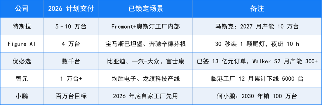 上海临港——智元总装+测试 苏州吴江——越疆 Atom 产线 宁波杭州湾——均胜电子头部总成 嘉兴南湖——敏实电子皮肤 绍兴嵊州——三花智控旋转/直线关节 深圳坪山——优必选 Walker 交付中心 东莞松山湖——蓝思科技灵巧手模组