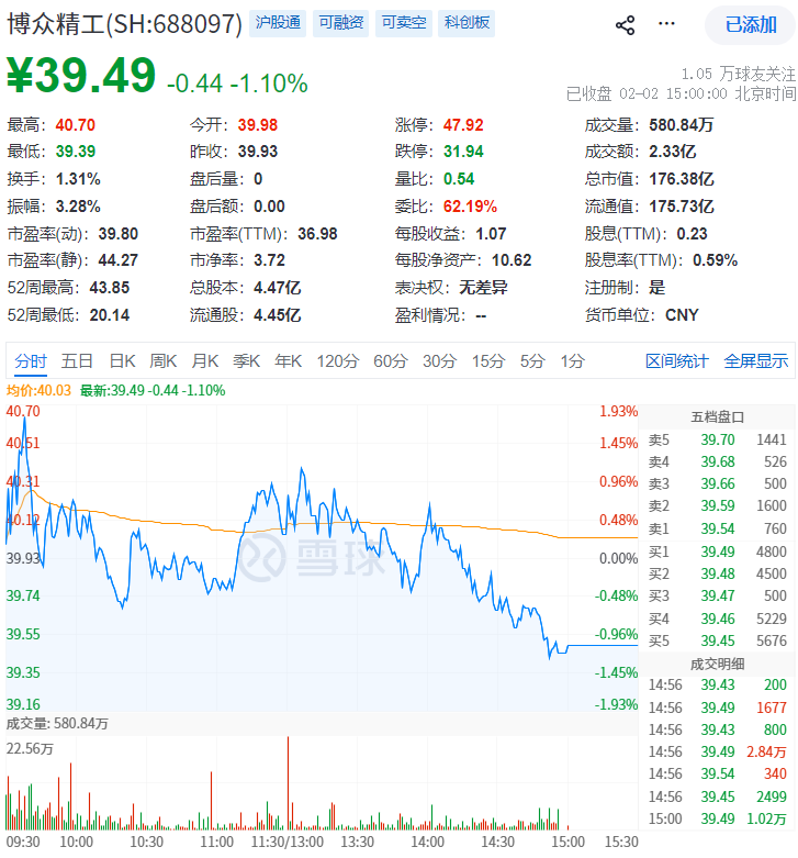 今开39.98元,今收39.49元,今日下跌1.10%;成交量580.84万股,成交额2.33亿元,换手率1.31%;收盘总市值176.38亿元。