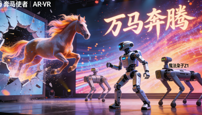 宇树“奔马使者”+魔法原子Z1机器人组队,搭配AR/XR技术,在“万马奔腾”的虚拟舞台上共舞,虚拟骏马破屏而出,绝对是朋友圈刷屏级画面!