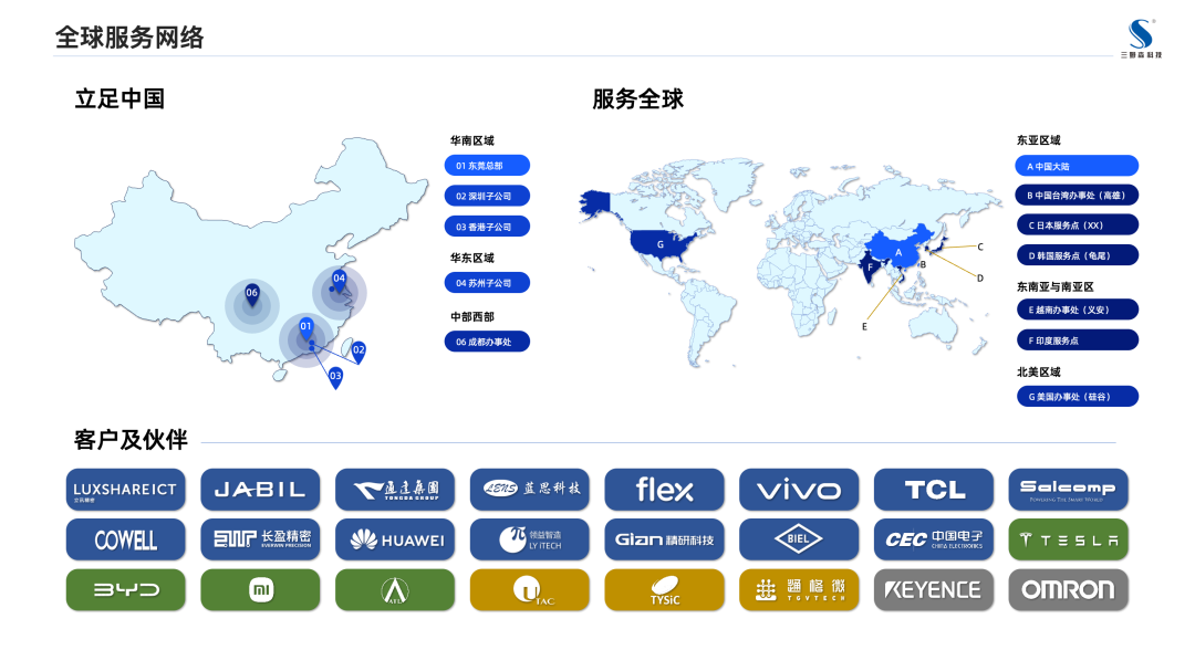 如今,三姆森已构建起完善的产业布局:拥有2大研发中心、2大生产基地及8家以上分子公司,团队规模超550名专业人才,累计获得100余项技术专利、50项软件著作权,并主导3项国家标准制定,荣获专精特新“小巨人”、国家高新技术企业等34项权威认证。业务覆盖3C电子、新能源三电、半导体及人形机器人等高精领域,服务网络辐射全球,为华为、OPPO、vivo、亿纬锂能等龙头企业提供定制化检测解决方案。