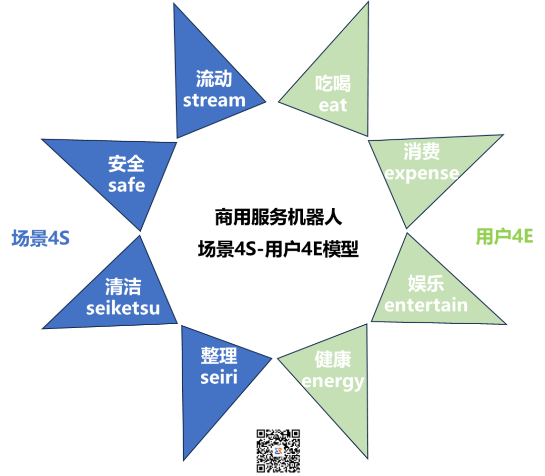 针对商用场景,我们提出并场景4S-用户4E模型作为参考,再结合需求强烈程度、技术实现难度做下分析,基本可以得到一个全局了解。详细内容可参考《商用服务机器人场景图谱及创新研判》这篇文章。