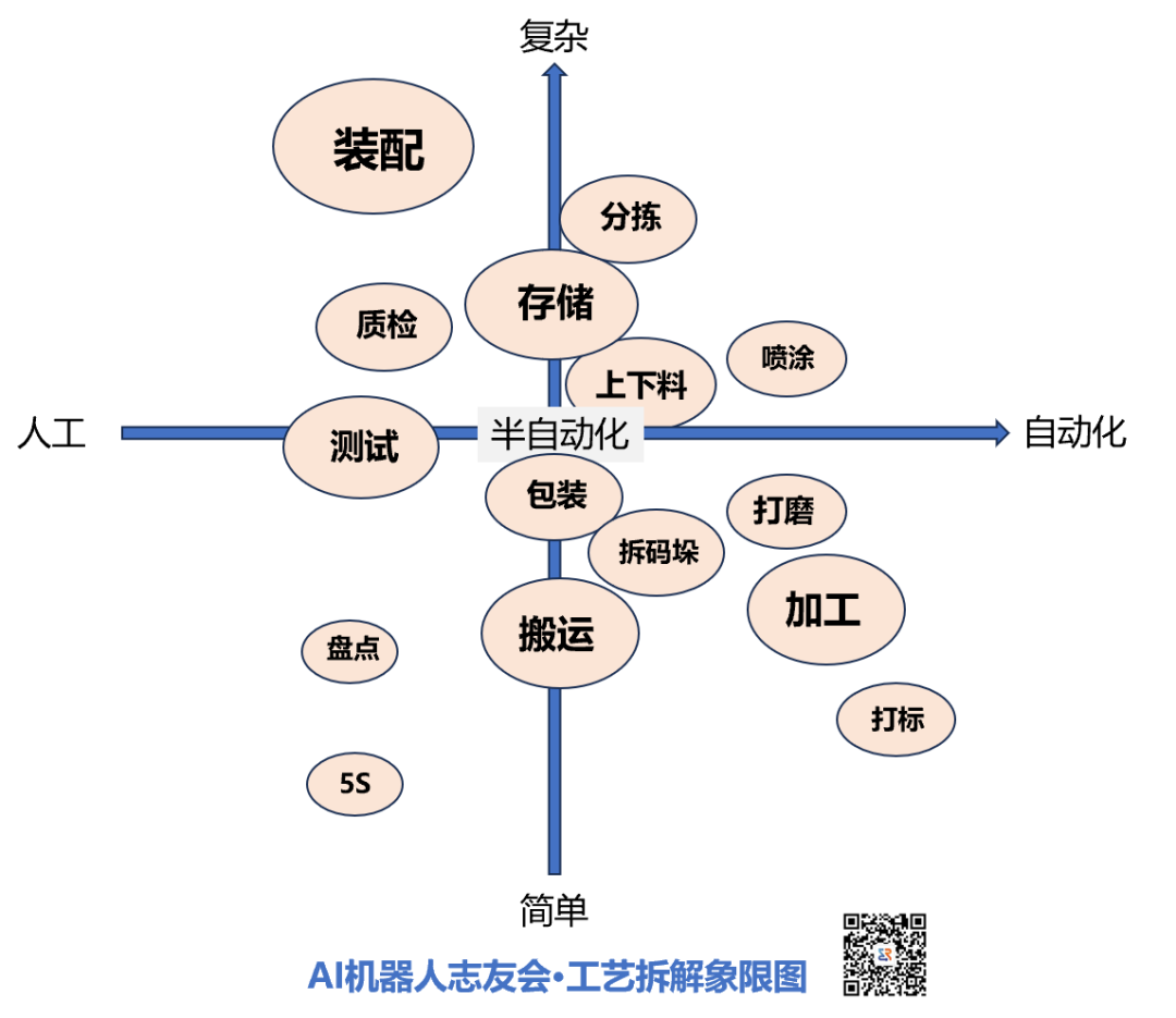 以前的文章中有推演过工业场景、商用场景的场景图谱及创新预判,从大的分类上来看细分场景非常多,涉及非常多的工艺流程细节。机器人的黄金场景并不一定是赚钱最多的细分场景,而是找到最匹配技术技能与流程工艺的场景。自动化的本质是用机器和系统把工艺进行标准化和简化,工艺就是理解场景的底层基本功。