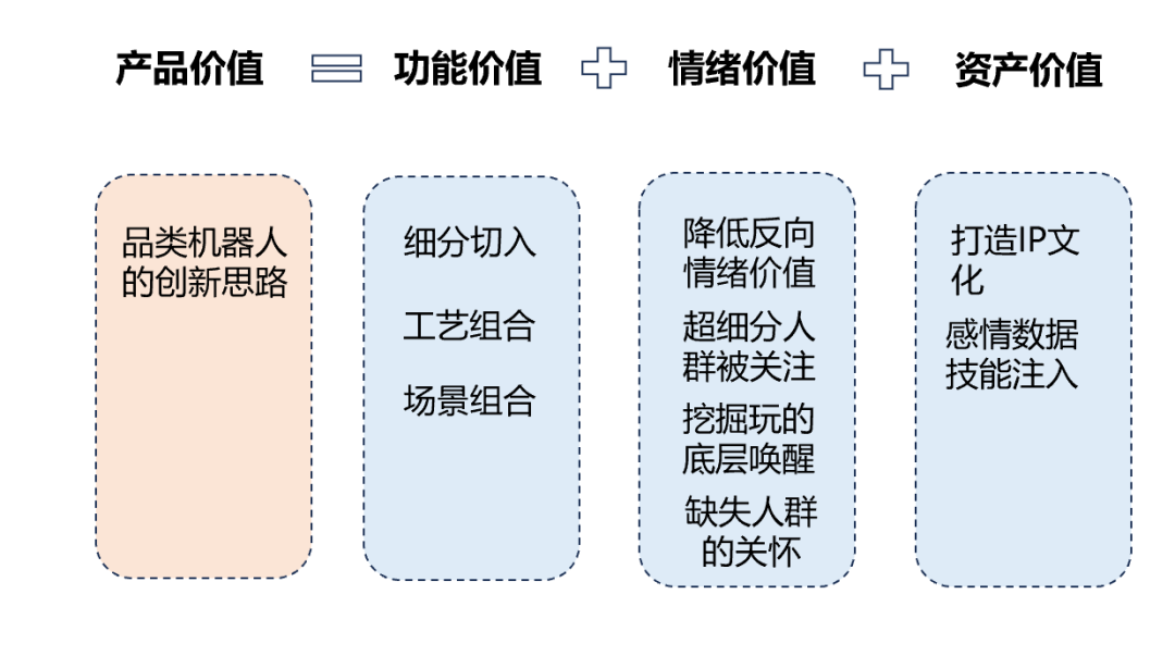 之前文章《机器人行业的真需求是什么?》中有体到产品创新就是创造新功能、新情绪和新资产。回顾百年来商品的演化,功能价值的商品一直在整合,情绪价值的商品一直在分化。简单来说,就是,工具越来越集成,情绪消费越来越多。
