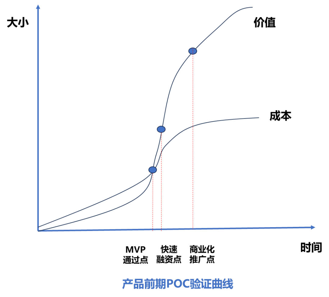 4)第一阶段,MVP通过点就是投入成本得到了价值的验证,这里的价值可能是虚的,类似客户满意度、潜在未来合作机会、团队成长、技术打磨等等,这个点主要让各方都有信心。第二阶段,过了这个MVP通过点之后就快速放大价值获取融资杠杆。第三个阶段就是继续累计价值,这里的价值就会变的越来越实,ROI各种账算得清清楚楚,快速放大商业化获取市场成功。