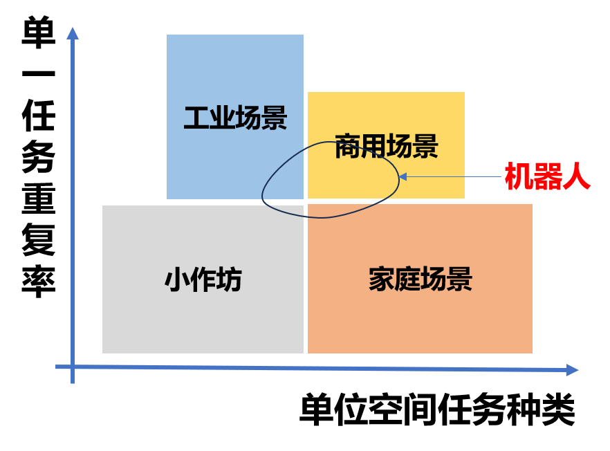 深度理解场景,我们认为有两个概念非常重要:一个是单位空间任务种类,一个是单一任务重复率。从大的场景出发,可以分为小作坊、工业场景、商用场景和家庭场景四大类场景,单位空间任务种类越多越适合人工来干,单一任务重复率越高越适合机器来干,部分任务种类数多且重复率较多的场景适合机器人来干。通过下面这张图我们可以推导出蛮多结论的。