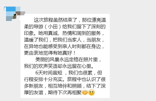 当 “粤港澳之旅” 的返程大巴稳稳驶入广元站,一场跨越 6 天、串联山海与都市的旅程落下帷幕。而我们收到的,不仅是游客们满溢的旅途回忆,还有群聊里满屏的点赞与留言 ,字里行间满是对全陪田良方的认可,更藏着对广元康辉的信任与赞扬。