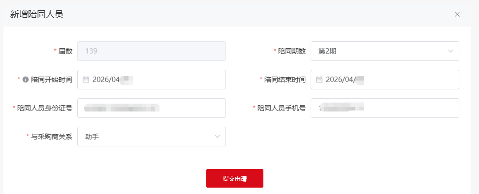 5.接下来,到了关键一步“添加陪同人员”,这里需要选择第几期,陪同日期,以及陪同人员的身份证,手机号码。填完这些信息,就会出现等待陪同人员确认。