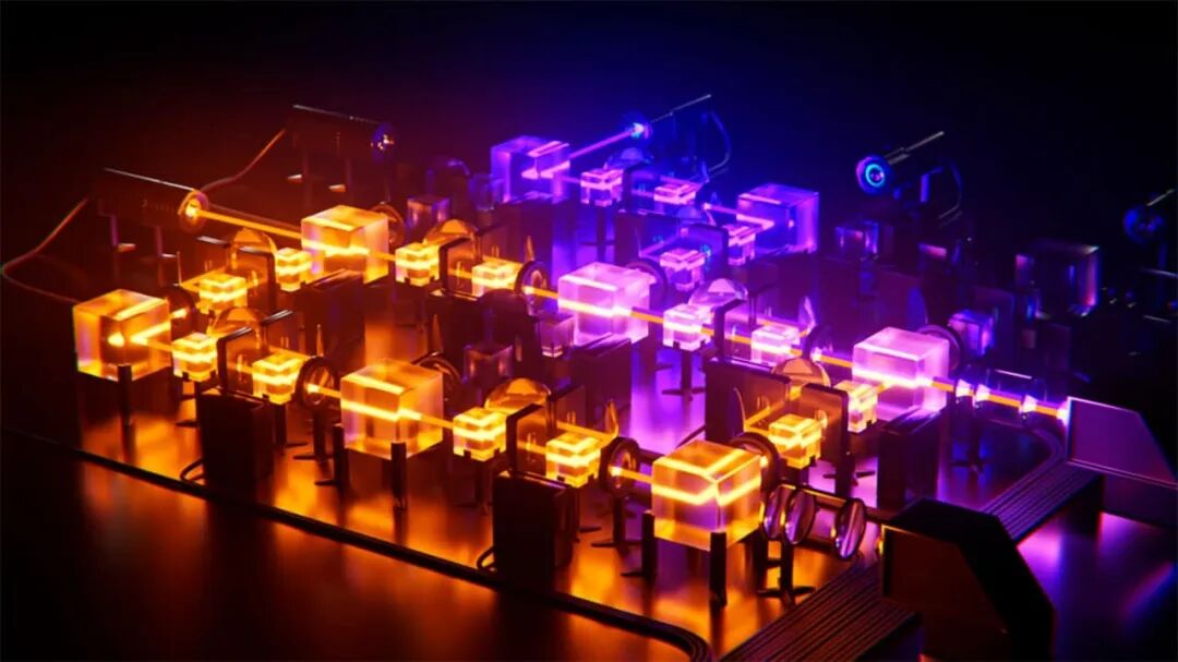 该装置展示了激光束经由一系列光学元件(包括分束器、空间光调制器及反射镜)构成的网络进行定向传导。这一设计生动诠释了XLuminA系统如何通过探索海量实验配置来发现新型超分辨率显微技术。图中发光的路径突显了系统自动寻优光操控路径的能力,从而实现了人类研究者前所未见的突破性光学设计