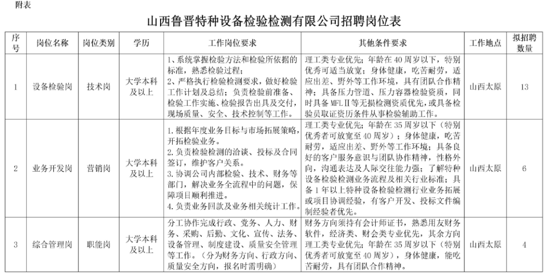 2.资格审查。对应聘人员的资格审查工作,贯穿招聘工作的全过程。进入面试的报考人员,需在规定的时间,按招聘简章及岗位要求,向用人单位提交《山西鲁晋特种设备检验检测有限公司招聘工作人员报名登记表》(附件)、身份证、本人学历相关证明材料、个人相关资质证明材料(原件及复印件,复印件由审核单位留存)。