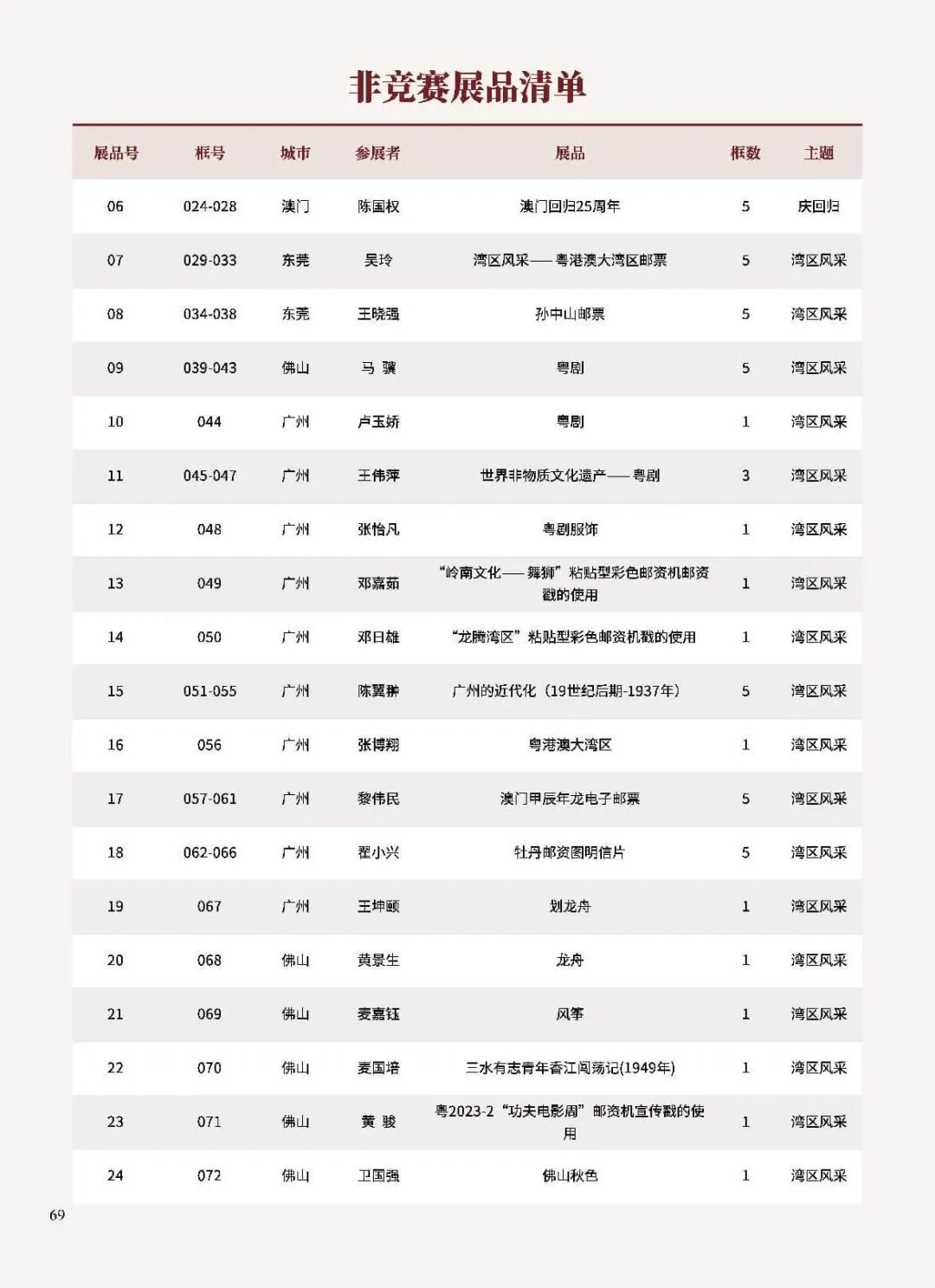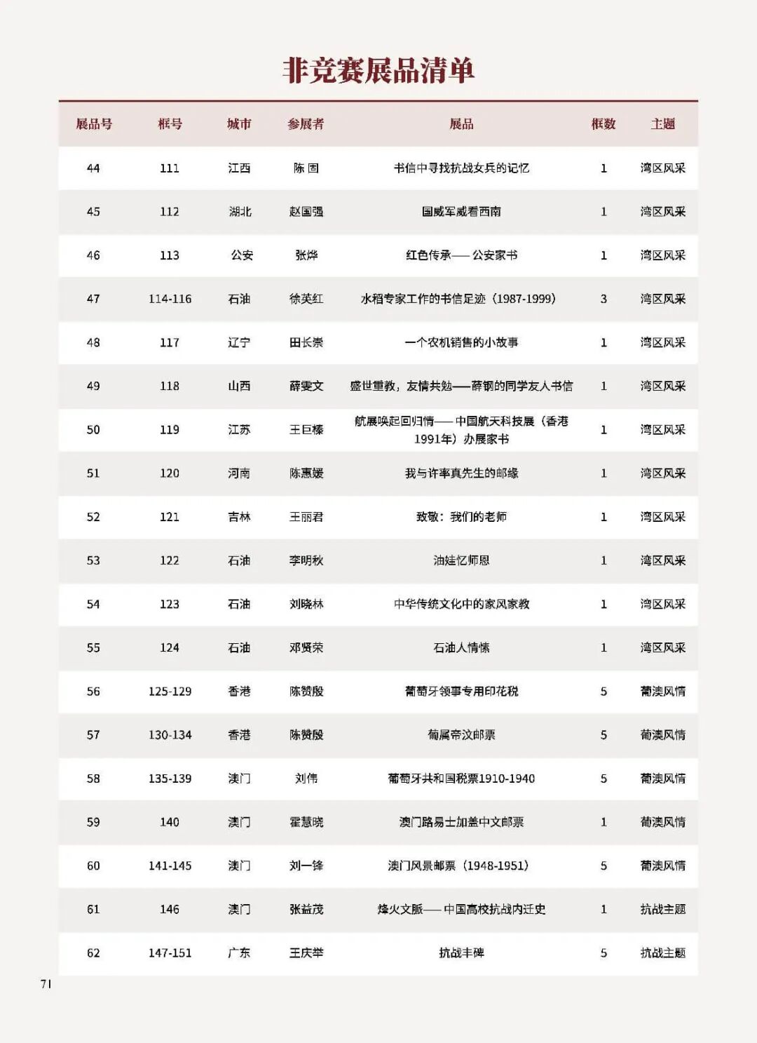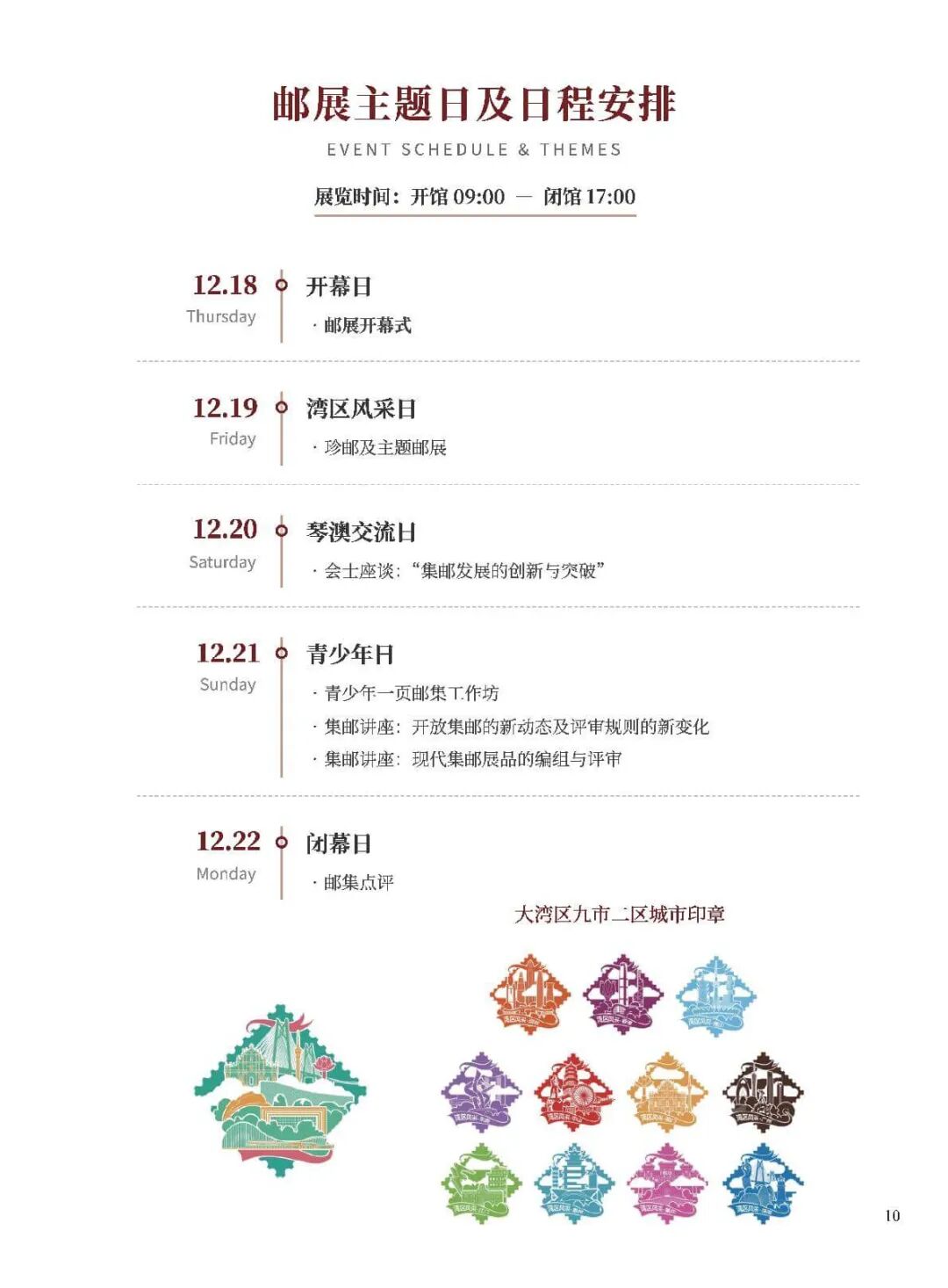 展览汇聚了全国31个省级集邮协会和澳门、香港集邮协会选送的10个类别307部1020框展品。其中竞赛展品238部842框,非竞赛展品69部178框。邮展设开幕日、湾区风采日、琴澳交流日、青少年日、闭幕日,主题活动丰富多彩、各具特色。