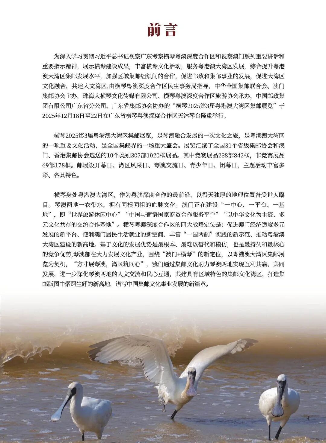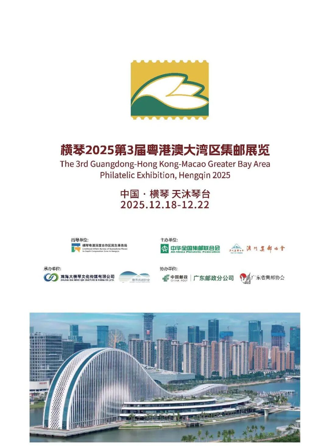 横琴2025第3届粤港澳大湾区集邮展览,是琴澳融合发展的一次文化之旅,是粤港澳大湾区的一项重要文化活动,是全国集邮界的一场重大盛会。本次展览由横琴粤澳深度合作区民生事务局指导,中华全国集邮联合会、澳门集邮协会主办,珠海大横琴文化传媒有限公司、横琴粤澳深度合作区旅游协会承办,中国邮政集团有限公司广东省分公司、广东省集邮协会协办,于2025年12月18日至22日在横琴粤澳深度合作区天沐琴台隆重举行。