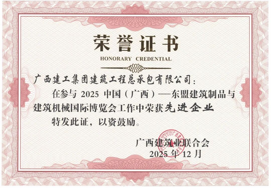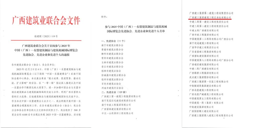 近日,广西建筑业联合会发布关于表扬参与2025年中国(广西)—东盟建筑制品与建筑机械国际博览会(以下简称“中国—东盟建博会”)先进协会、先进企业和先进个人的通报,广西建工集团建筑工程总承包有限公司因在观展组织工作中的突出贡献,获“先进企业”通报表扬。