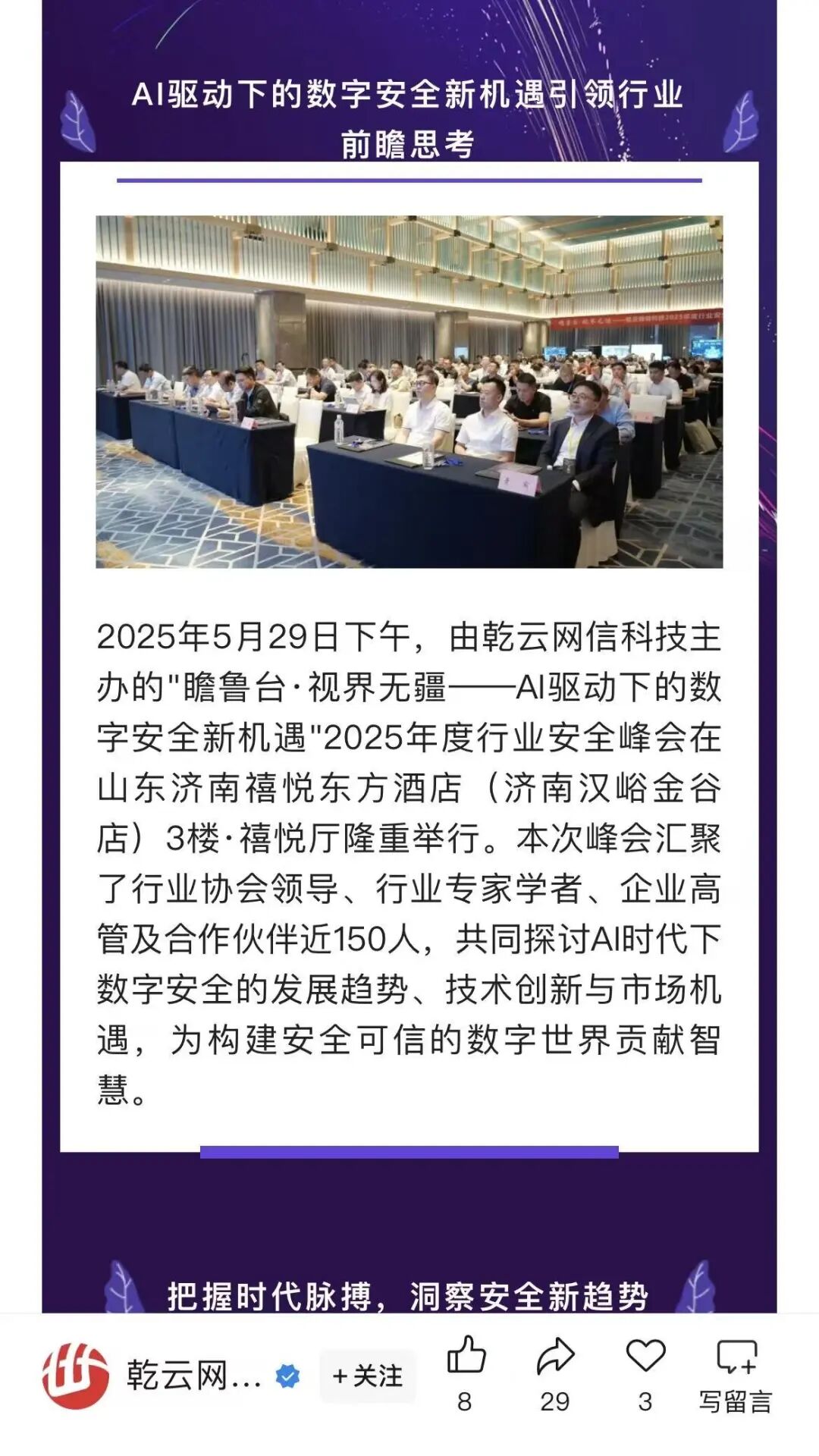 山东网信安全科技有限公司(简称“网信科技”)隶属于乾云集团,是山东省信息科技领域的重要企业之一,致力于提供全方位的数字安全服务。我们通过零信任架构、微隔离方案、AI智能分析和数字水印技术,保障客户数字资产的安全性与完整性。