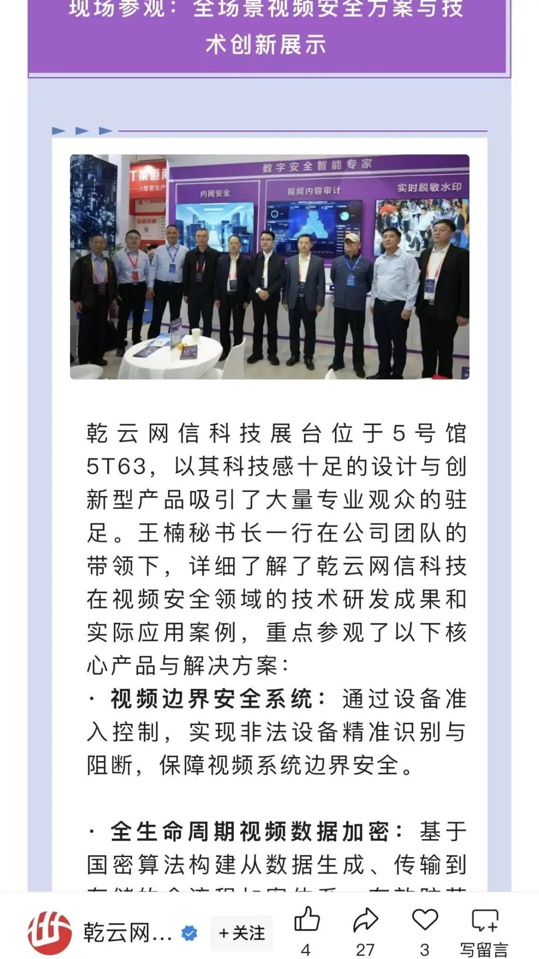 依托集团强大的技术实力,网信科技形成两大核心产品线:视盾视觉安全智能产品线结合AI智能分析和数字水印,提供全面的视频网络安全解决方案;乾云盾网络安全产品线运用零信任架构和微隔离技术,构建内网、云及终端多层次防护体系。
