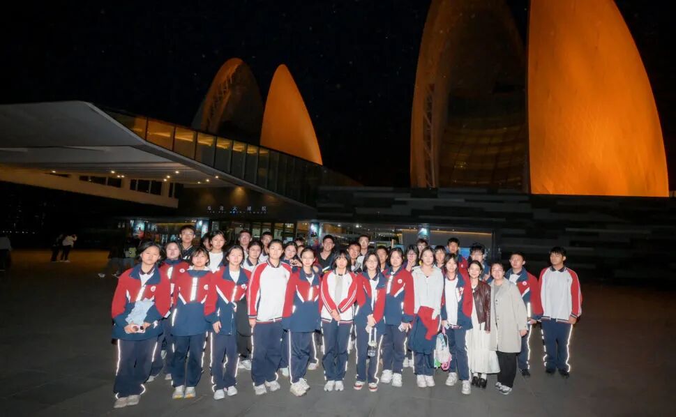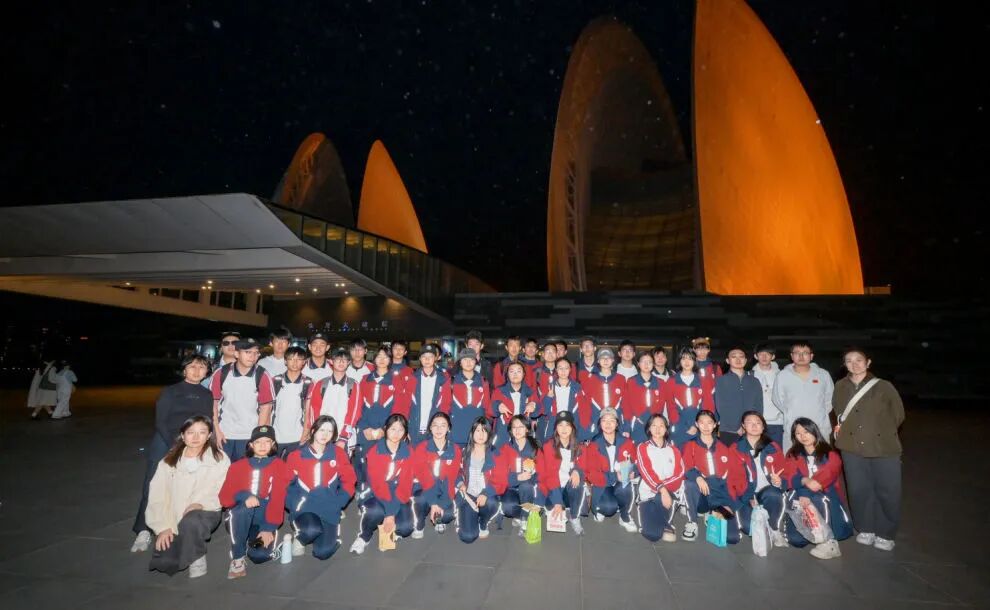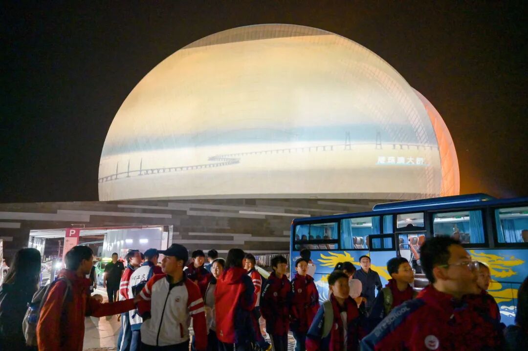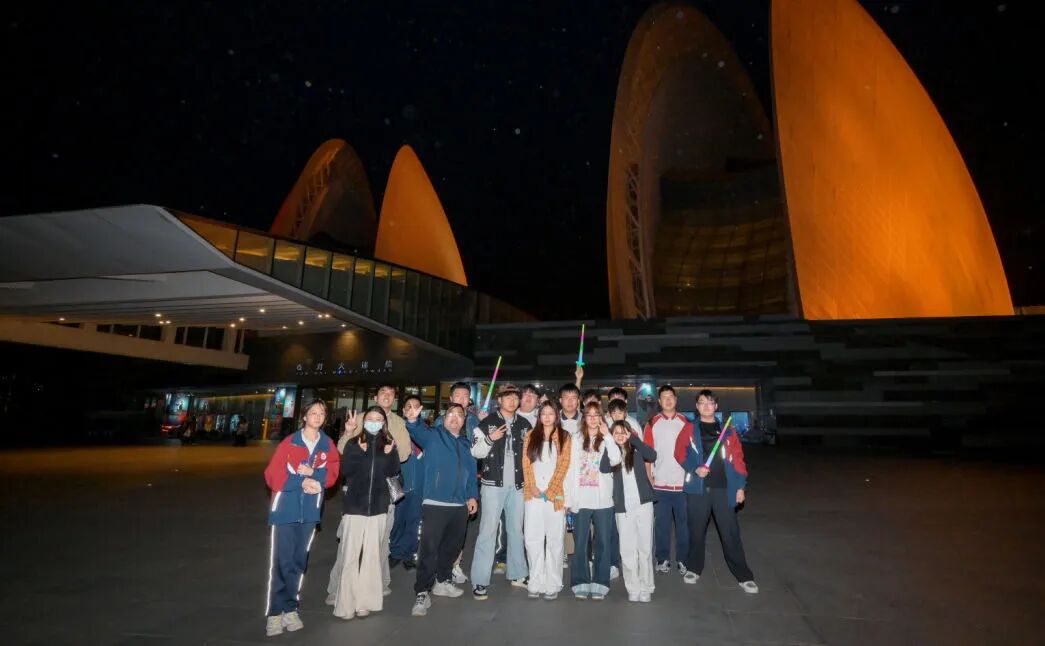 在珠海地标——“日月贝”大剧院,踏着伶仃洋的晚风,同学们俯瞰着港珠澳大桥如钢铁巨龙跃动星海之间,仔细观察着“日月贝”建筑与海洋、山体的融合设计,在月光与灯光交织下尽情享受山海之间的温柔浪漫,体会“人与自然和谐共生”的设计理念。